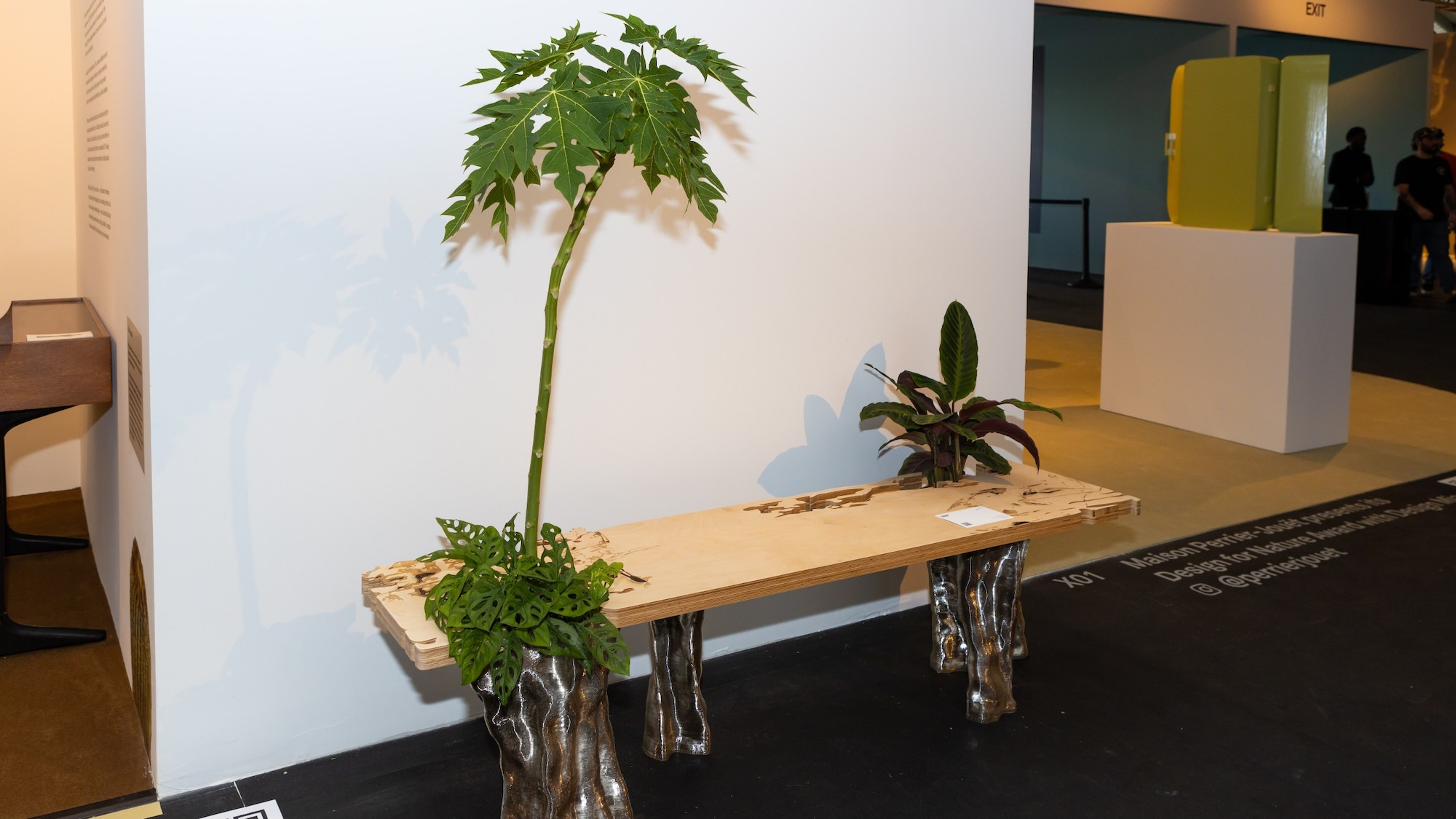 На выставке была представлена скамья из фанеры с ножками-«пнями», в которых размещён грунт. То есть опоры скамьи стали полноценными кашпо для живых растений.