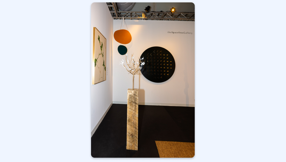 Интересный приём — минималистичные настенные панели вместо картин и скульптурное «дерево». Подобные композиции на выставке демонстрируют тренд на сочетание ремесленности и графичной лёгкости. Геометрия подвесных панелей напоминает морские камешки, а дерево на пьедестале из массива, добавляет в экспозицию ощущение тёплой несовершенности.