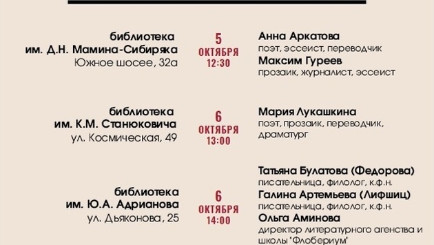 В библиотеке имени Мамина-Сибиряка, расположенной на улице Южное Шоссе, 32, а, 5 октября в 12:30 читатели встретятся с поэтом, переводчиком и обозревателем журнала «Pshychologies» Анной Аркатовой, а также с автором и режиссером более 70-ти документальных фильмов Максимом Гуреевым.
