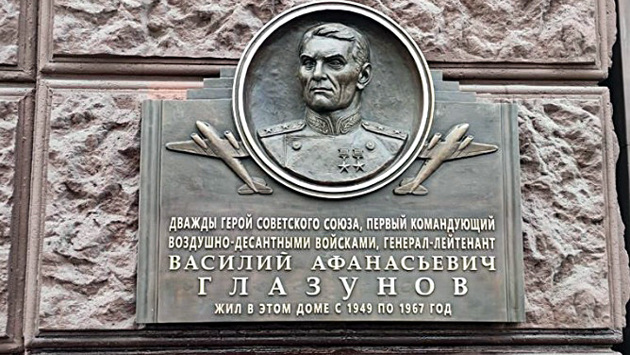 Накануне Дня Победы по адресу: Ленинградский проспект, дом 75, корпус 1 в районе Сокол прошло торжественное открытие мемориальной доски дважды Герою Советского Союза, генерал-лейтенанту Василию Глазунову. Инициатором установки выступило Командование Воздушно-десантных войск Вооруженных Сил Российской Федерации. «В преддверии 78-й годовщины Победы в Великой Ответственной войне в Москве на Ленинградском проспекте появилась мемориальная доска в память о дважды Герое Советского Союза Василии Афанасьевиче Глазунове, чей подвиг мы хорошо помним. Во время наступления на Берлин корпус под его командованием участвовал в прорыве обороны противника на Зееловских высотах и форсировании реки Шпре. Мемориальную доску установили на доме, где Василий Афанасьевич жил с 1949 по 1967 год», - сказал руководитель Мосгорнаследия Алексей Емельянов. Мемориальная доска с барельефным скульптурным изображением и надписью изготовлена из бронзы авторским коллективом в составе скульптора Алексея Игоревича Игнатова и архитектора Антона Станиславовича Королёва. В церемонии открытия мемориальной доски приняли участие представители федеральных и столичных органов власти, общественных, ветеранских и молодежных военно-патриотических организаций, средств массовой информации, военнослужащие Воздушно-десантных войск, коллеги и родственники Василия Афанасьевича, москвичи и гости столицы. Василий Афанасьевич Глазунов – советский военачальник, первый командующий Воздушно-десантными войсками, генерал-лейтенант, дважды Герой Советского Союза. В январе 1946 года был назначен на должность командира 125-го стрелкового корпуса, а в июне того же года – на должность генерал-инспектора Воздушно-десантных войск Главной инспекции сухопутных войск.