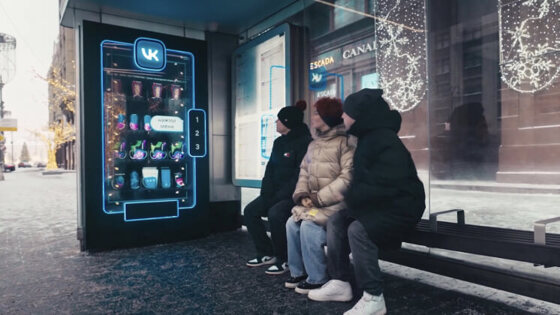 В преддверии праздника VK стилизовала остановочный павильон в центре Москвы под новогодний интерактивный вендинг. При выборе пользователем одного из товаров в вендинге запускается анимация со стикерами-маскотами VK: псом Спотти, котом Персиком, единорогом Спарксом и собачкой Дигги.