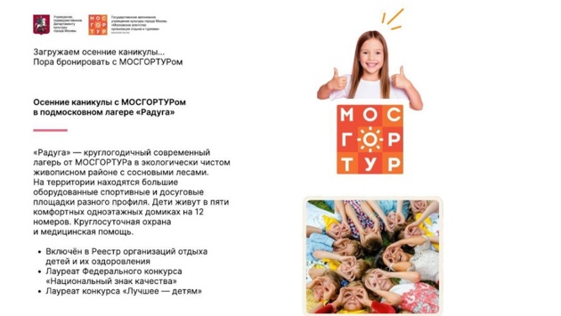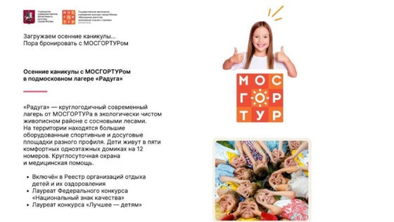 Подведомственное Департаменту культуры города Москвы Государственное автономное учреждение культуры города Москвы "Московское агентство организации отдыха и туризма" является уполномоченным учреждением по организации отдыха и досуга детей. В целях организации выездных программ для детей работников органов исполнительной власти и подведомственных им учреждений ГАУК "МОСГОРТУР" разработаны специальные коммерческие предложения на смены, проводимые в обособленном подразделении ГАУК "МОСГОРТУР" детский оздоровительный лагерь "Радуга", а также в загородных объектах отдыха Московской области (прилагается). С подробной информацией об объектах отдыха и специальных предложениях можно ознакомиться на сайте: https://corp.mosgortur.ru/mocamps. Контактное лицо от ГАУК "МОСГОРТУР" – Яковлева Александра Михайловна, телефон: +7 (925) 500-02-64, электронная почта: YakovlevaAM1@culture.mos.ru.