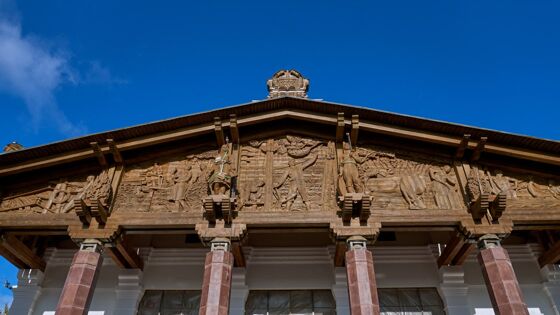 Сейчас скульпторы воссоздают утраченные барельефы вводного зала по историческим фотографиям. Полутораметровые изображения людей перекликаются с теми, что находятся на фасаде: земледельцами, строителями с цепной пилой и, конечно, густым карельским лесом на фоне.