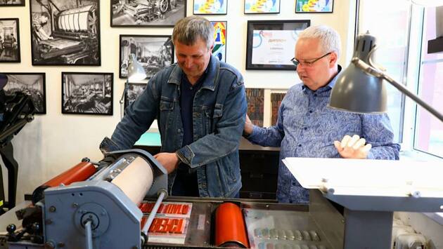 Музей-студия высокой печати Letterhaus провел экскурсию по наборному цеху и продемонстрировал гостям процесс печати на старинном станке.