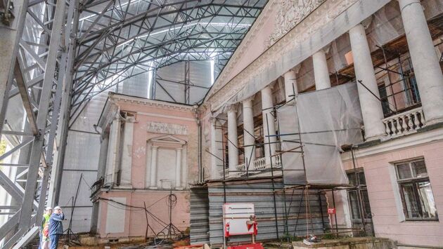 Центральная часть усадьбы — дворец-театр — в настоящее время укрыт временной кровлей. Это сделано, чтобы защитить его конструкции на период проведения реставрационных работ. Алексей Емельянов уточнил, что монтаж металлических ферм осуществляется с использованием крана грузоподъемностью 750 тонн. Это единственный пример, когда временной кровлей с помощью самого мощного крана в России накрыли здание такого масштаба и исторической значимости.
