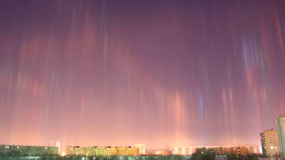 Световые столбы возникают, когда свет отражается от плоских шестиугольных кристаллов льда. Сами столбы при этом выглядят ровными и узкими и похожи на ледяные иглы.