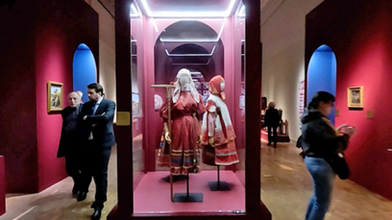 Национальный колорит на выставке - это настоящая энциклопедия текстиля и русских костюмов. От Архангельска на севере до Воронежа на юге. Ткани отечественных мануфактур не уступали лионским шелкам. Здесь соседствует золотое шитье 18 столетия и современная "Крестецкая строчка" с многовековой историей. А коллекция кружева и ковров Русского музея - самая большая в мире. Передавая дух времени, как эти ажурные символы советской эпохи, русские традиции объединяют прошлое и настоящее.