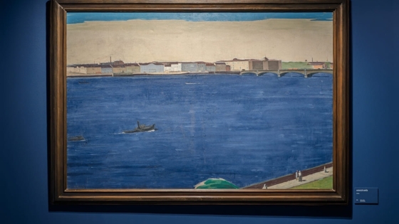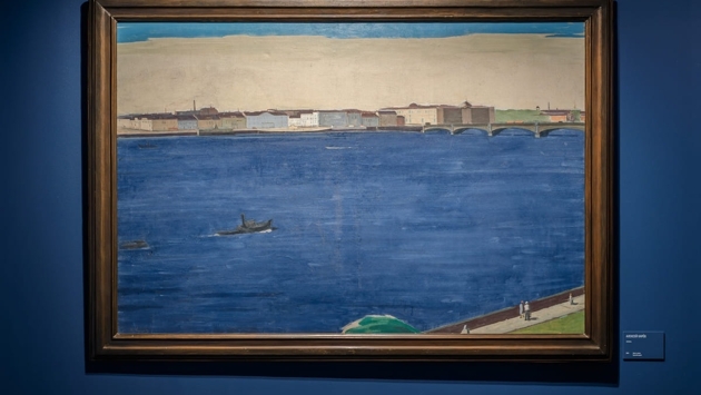 Центральный экспонат «карёвского зала» на выставке — полуабстрактный вид Невы: большую часть полотна занимает яркий и жизнеутверждающий ультрамарин невской воды.