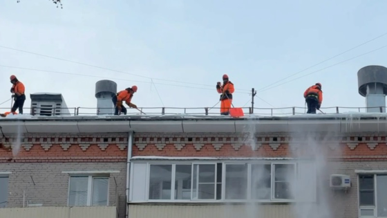 В течение светового дня проводится очистка от снега и наледи скатных кровель многоквартирных домов, выступающих элементов фасадов зданий, водосборных желобов и воронок водостоков.