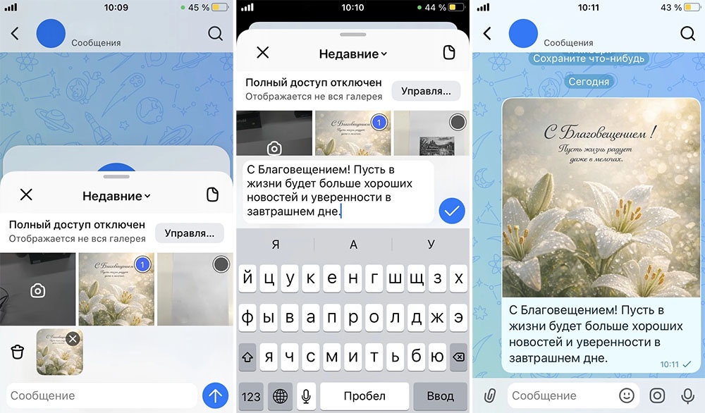 Чтобы отправить открытку на Благовещение через мессенджер МАХ без потери качества, достаточно выбрать картинку в форматах JPG или PNG и не обрезать ее при отправке.
