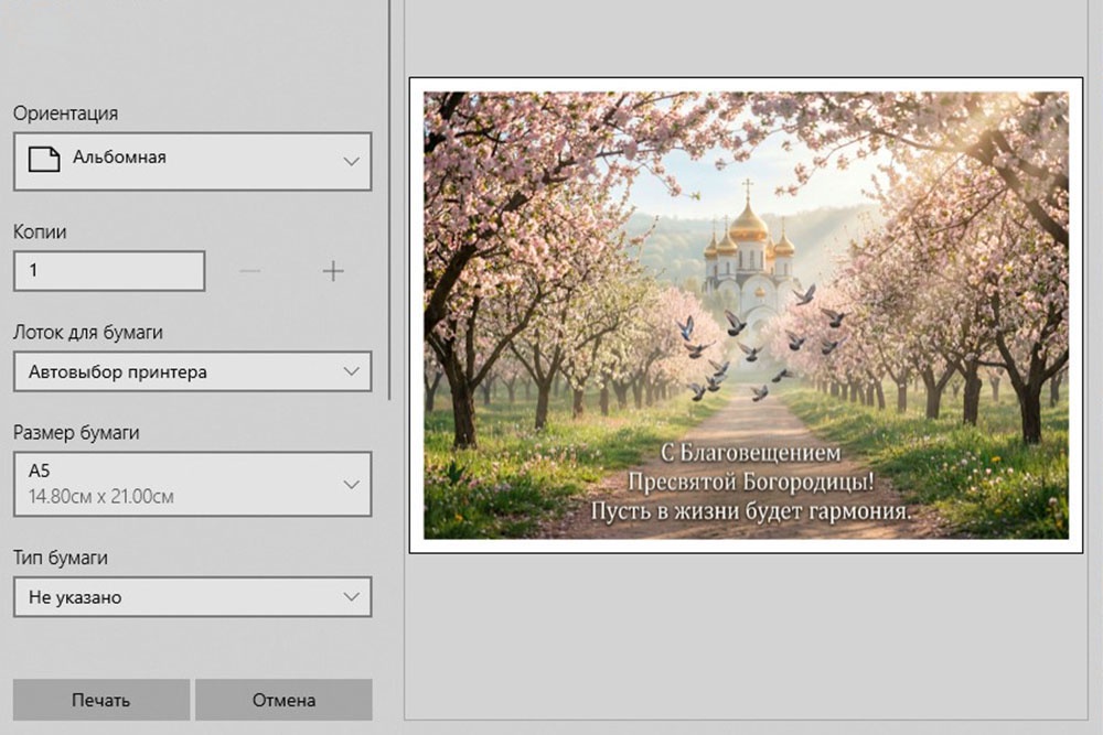 Для печати открыток к Благовещению (7 апреля) подходят изображения в высоком разрешении (от 300 dpi) с изображением Богородицы, Архангела Гавриила, белых голубей, весенних цветов или храмов. Идеальны форматы А6 (105x148 мм) или евро-формат (200x100 мм), лучше всего использовать плотный картон (250-300 г/кв.м).