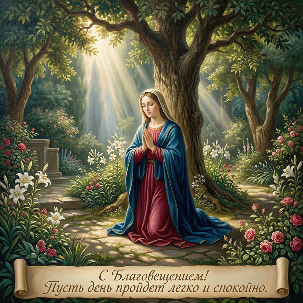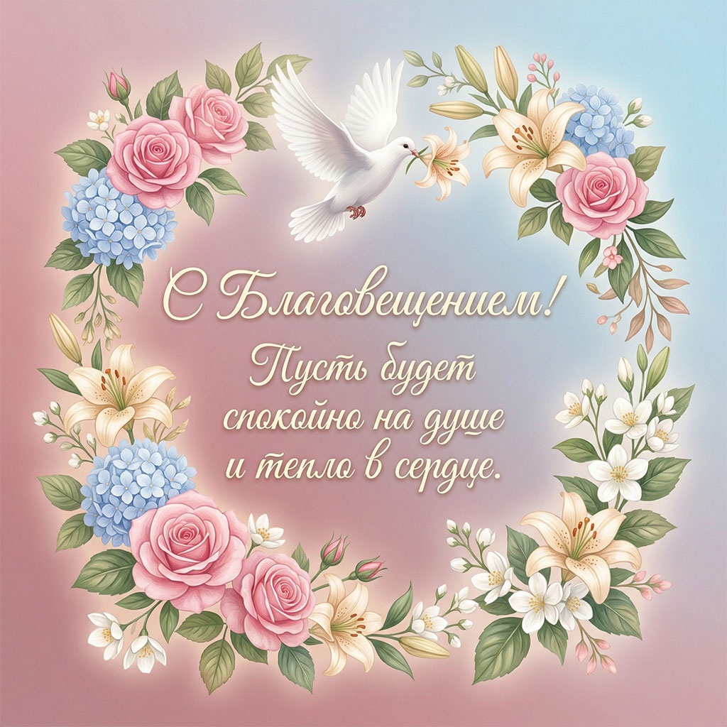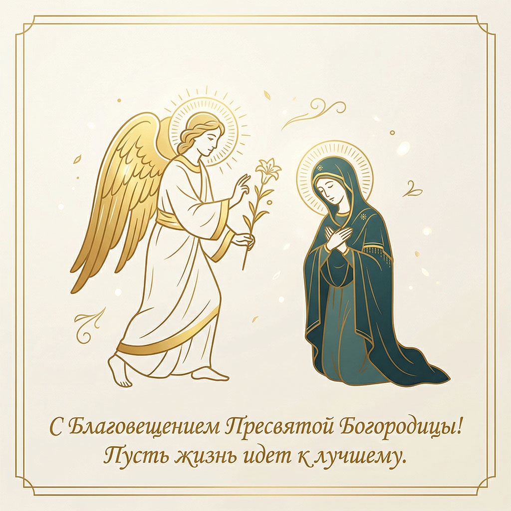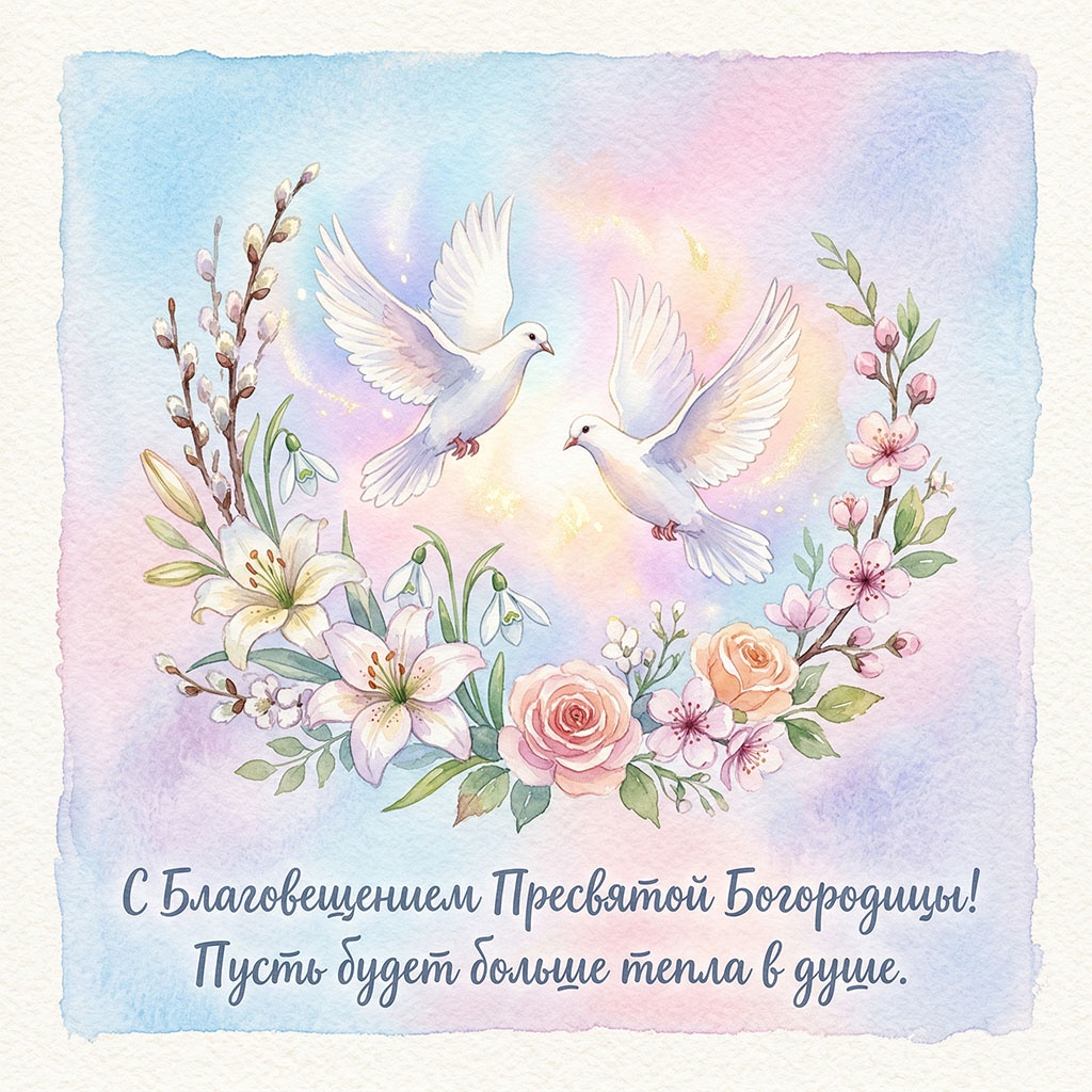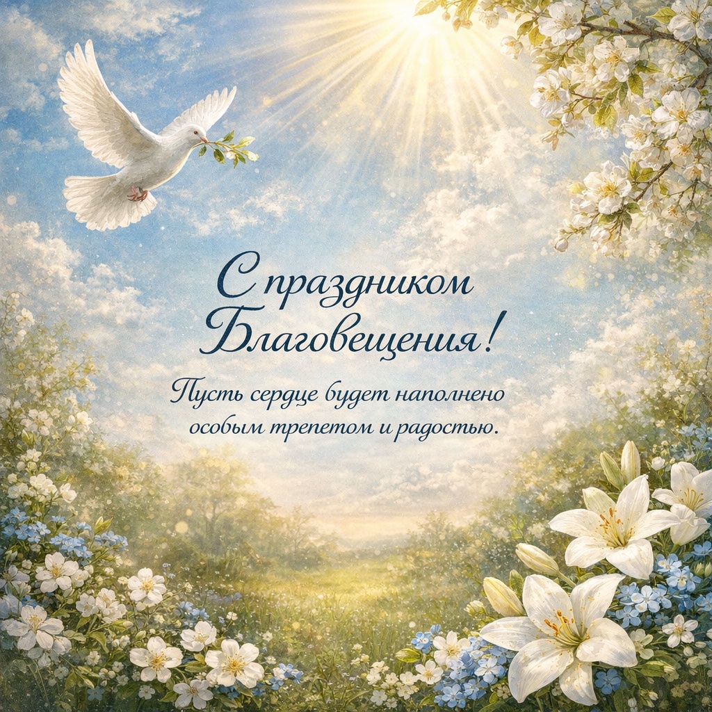 Для семейного поздравления с Благовещением (7 апреля) лучше выбирать светлые, душевные открытки с изображением Богородицы и Архангела Гавриила, белых голубей, весенних цветов или икон праздника. Популярны сюжеты, символизирующие благую весть, надежду, мир в семье и весеннее обновление, часто с теплыми пожеланиями здоровья и добра.