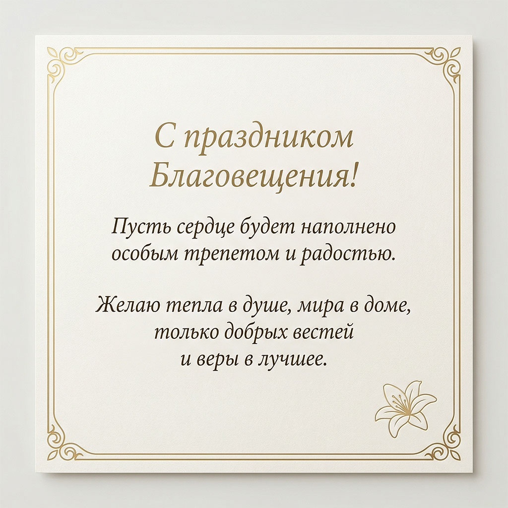 Поздравления с Благовещением коллег и знакомых стоит формулировать нейтрально, без лишней интимности, но с теплотой - важно, чтобы текст звучал естественно и соответствовал характеру ваших отношений.