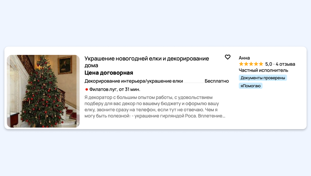 По мере приближения Нового года на популярных онлайн-платформах с объявлениями появляется всё больше необычных услуг. Теперь можно не только арендовать праздничную ель, но и нанять профессионального декоратора для украшения дерева. Сервис работает следующим образом: выбранный специалист за оговорённую сумму подготовит дизайн-проект и украсит вашу искусственную или живую ель. Как правило, игрушки и декор для этих целей покупают отдельно, но иногда опытные декораторы предлагают арендовать свои украшения.