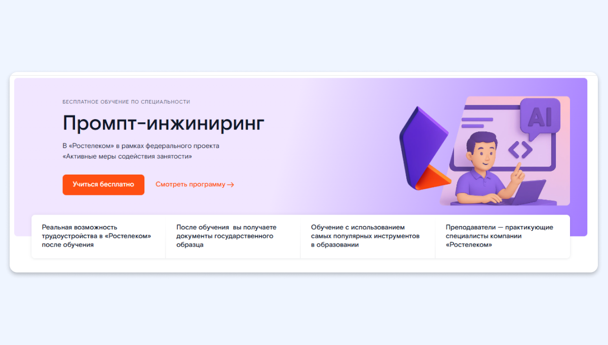 Что вы сможете после обучения: использовать текстовые запросы (промпты), чтобы решать разные задачи: от планирования путешествий до оптимизации бизнеса. После успешного завершения курса вы получите официальный сертификат и возможность трудоустройства в компанию «Ростелеком».