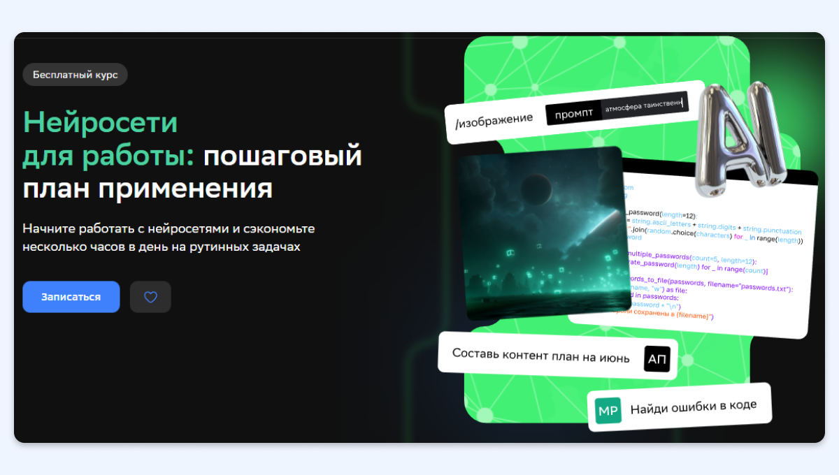 Курс по применению нейросетей от «Нетологии» предназначен для тех, кто хочет упростить повседневные задачи и освободить время для творческой и стратегической работы.