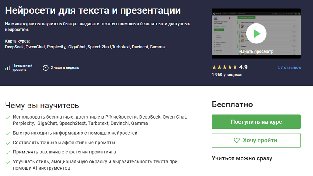 Образовательная платформа Stepik предлагает научиться эффективно использовать нейросети для быстрого создания качественных текстов и презентаций, применяя бесплатные ИИ-инструменты, доступные в России.