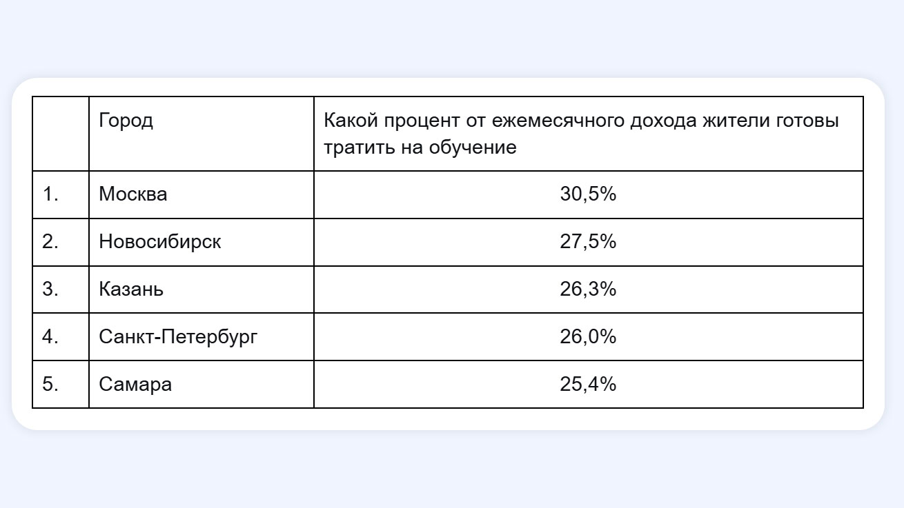 Москва лидирует по доле дохода: здесь готовы отдать на образование 30,5%. В Новосибирске этот показатель — 27,5%, в Казани — 26,3%, в Санкт-Петербурге — 26%, в Самаре — 25,4%.