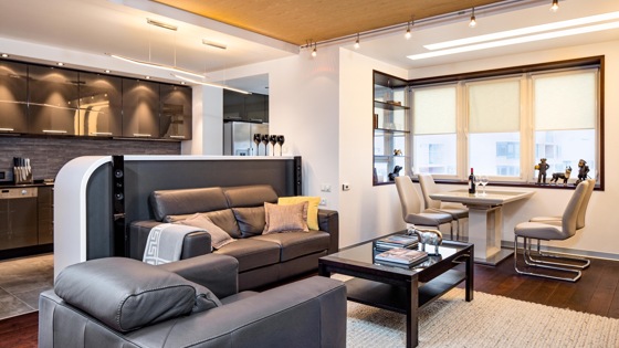 Молодой энергичный заказчик приобрёл квартиру на верхнем этаже монолитно-бетонной новостройки, откуда можно обозревать перспективу столицы с высоты птичьего полёта. Выбор жилья соответствовал характеру владельца, привыкшего учитывать все детали и держать всё под контролем. В квартире требовалось сохранить максимально открытое пространство и создать ощущение простора, спланировав большую часть интерьера по принципу open space, а также предусмотреть доступ к окнам. Отделить предстояло только комнату для сна. Ещё одно требование — минималистичность обстановки и отделки, но без унылого ахроматизма, а с использованием тёплой, «живой» древесины. Перепланировка Прямоугольник квартиры с интегрированной в него лоджией и двумя окнами внутри разделён несущими стенами (длинный отрезок — между спальней и гостиной, широкий и короткий — между ванной и кухней, несущая колонна — на обращённом к гостиной углу лоджии). Лоджию решили утеплить и присоединить, получив соответствующие разрешения, ванную — удлинить за счёт части примыкающей прихожей, кухонную зону полностью раскрыть в сторону гостиной. Несколько расширили будущую гардеробную, присоединив к ней часть пространства между прихожей и спальней. Ремонт Демонтировав ненесущие перегородки, новые возвели из пазогребневых блоков, выполнили стяжку. Удалив дверной и подоконный блок между кухней и лоджией, обнаружили небольшой «резерв»: несущие конструкции позволили расширить проём на 10 см. Со стороны столовой-гостиной демонтировали боковую часть остекления и оставили проём открытым. Пол в лоджии утеплили. В зоне проёма в пол встроили конвектор (вместо демонтированного радиатора). В спальне предусмотрели шумоизоляцию. Полы в прихожей, кухне и лоджии облицевали керамогранитом, в остальных помещениях — паркетной доской. Потолки выровняли гипсокартоном, этот же материал использовали для создания широких подшивных «арок» по обеим сторонам зоны гостиной. Стены оштукатурили и частично покрасили, для получения идеально однородной поверхности использовали краскорас пылитель. В гостиной часть стены и потолок оклеили шпонированными «обоями». В спальне стену напротив кровати отделали декоративной штукатуркой, имитирующей тканевое плетение. Подобрали металлизированные плинтусы, соответствующие общей концепции оформления. Стеклопакет в лоджии заменили. Подоконник в зоне столовой выполнили из шпонированной деревом MDF, а в лоджии и спальне — из литьевого камня. Для цельности обстановки и для удобства часть мебели в квартире мы спроектировали индивидуально, в том числе стеллажи, навесной комод в гостиной, барную стойку, о которой мечтал владелец, мебель в лоджии, столешницу с умывальником в ванной. Присоединённая лоджия позволила «разгрузить» кухню: появилась возможность поместить большой холодильник за выступом перегородки. Справа от него установили скамью со встроенным под сиденье шкафом, а под потолком — стеллаж для бутылок и закрытую секцию для хранения. В гардеробной систему освещения оборудовали датчиком присутствия. Елена Тамбиева, Наталья Водопьянова Архитекторы Дизайн Прихожая, гостиная, столовая и кухня, а также соседствующая с последней зона в лоджии представляют собой единое открытое и очень просторное, наполненное светом пространство с перетекающими друг в дру