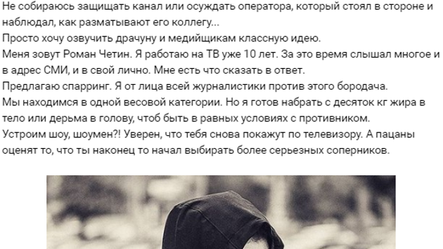 Журналист Роман Четин предложил спарринг Александру Орлову по прозвищу Колобан, который ударил в челюсть корреспондента НТВ 2 августа. «Я от лица всей журналистики против этого бородача», — заявил Четин. Он рассказал, что живет в Перми и проработал на телевидении уже десять лет, много всего повидал и ему есть что сказать в ответ. Он добавил, что ему придется «набрать с десяток кг жира в тело или дерьма в голову», чтобы оказаться в равных условиях с противником. «Устроим шоу, шоумен?! Уверен, что тебя снова покажут по телевизору. А пацаны оценят то, что ты наконец то начал выбирать более серьезных соперников», — провоцирует журналист Орлова. Позднее Роман Четин заявил, что готов ради боя приехать в Москву. При этом он выдвинул условие, что поединок должен проходить в присутствии других журналистов. «Главный фигурант этого видео уже сделал свой шаг к славе — не постеснялся показать себя на камеру. Полагаю, что и бой он предпочтет проводить при камерах», — пояснил пермский «богатырь». О том, что Роман Четин выглядит действительно внушительно, говорят его фотографии в соцсетях. Мужчина много времени посвящает тренировкам, и нельзя не заметить его настойчивого стремления совершенствовать тело. В свою очередь, страница Александра Орлова говорит, что он совершенствоваться предпочитает не в спортзале, а в уличных драках. Говоря о мотивах своего поступка, Роман Четин указывает на отношение общества к людям его профессии: «Очень хочется, чтобы люди стали уважительнее относиться к журналистам. Особенно, когда те находятся на рабочем задании». В комментарии URA.RU журналист добавил, что сам в свое время сталкивался с тем, что довелось пережить его коллеге с НТА Никите Развозжаеву. Четин признался, что именно после подобного случая он начал ходить в спортзал, однако боевые искусства он, по его словам, не изучал. Как сообщал «Ридус», 2 августа в парке Горького корреспондент Никита Развозжаев в прямом эфире телеканала НТВ поздравлял всех десантников с праздником. Внезапно в кадре появился подвыпивший Александр Орлов, кричавший: «Моя страна, с***, Украину захватим!» Журналист попросил его замолчать, рукой стараясь отстранить за пределы кадры. Тогда Орлов, ярый фанат «Спартака», замахнулся и двинул Развозжаеву в челюсть. На этом эфир из парка отключился, а растерянная ведущая Валерия Гавриловская растерянно сообщила: «У нас возникли какие-то проблемы», — благодаря чему прославилась в соцсетях. Вскоре Александра Орлова задержали сотрудники Росгвардии. В отделении полиции мужчина протрезвел и предложил корреспонденту «добазариться» — договориться о денежной компенсации.