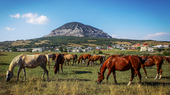 — У нас никто не говорит: «поселок Новотерский», это место всегда называлось конным заводом. Сейчас тут построили санаторий, заводы минеральной воды, но, если надо сюда ехать, объясняй: «В конезавод». Таксист из Минеральных Вод везет меня мимо широких полей с катушками сена, мимо виднеющихся вдалеке лошадиных табунов, мимо гор, окруживших Новотерский. Их пять: Змейка, Развалка, Бештау, Железная, Лысая. Ближе всего — Змейка, у ее подножья и начиналась история поселка. Еще в 80-е годы почти каждая семья в Новотерском была связана с заводом: здесь жили и работали конюхи, ветврачи, зоотехники, жокеи, тренеры, кузнецы. Сейчас многое изменилось. Работа мечты Один из выступов Змейки по форме напоминает медведя. Местные говорят: пока медведь присматривает за поселком, все будет хорошо. У подножья горы уже больше ста лет пасутся лошадиные табуны. Из окна квартиры в пятиэтажном доме, где живет Алена Акимова, видно и скалу-медведя, и подножье Змейки. Каждый вечер Алена подходит к окну, чтобы посмотреть, как возвращаются с выпаса лошади. Осторожно спускаются по крутому холму, а по равнине несутся так быстро, что дыхание перехватывает, даже когда смотришь издалека. — Я могла остаться в Москве после диплома. Муж — москвич, там есть жилье. Но решила вернуться в родной Новотерский: хотела работать с лошадьми на Кавказе. Муж поддержал, устроился по своей специальности — агрономом в сады. Алене 26 лет. Она начкон (начальник конно-производственного отдела) на пятигорском ипподроме. В детстве училась верховой езде у именитого тренера Владимира Страхова, бывшего работника Терского завода. Выучилась на зоотехника в Тимирязевской академии, сейчас учится в аспирантуре, ее научные работы связаны с арабской породой. — Конники едут в поселок со всей страны. Если человек занимается «арабами», работа мечты — Терский конный завод, самое большое хозяйство по этой породе в России. Можно работать в трех направлениях: скачки, пробеги, шоу-класс. А местные уже забывают конюшни. Началось в 90-е: сначала в школу верховой езды ходило чуть меньше половины моего класса, потом — несколько человек. Хотя увлеченные конники ехали на Терский даже в нулевые, голодные для завода годы. В конце 2000-х жизнь на Терском стала налаживаться, а пару лет назад завод вышел в прибыль. Это редкость: почти все российские конезаводы убыточны, для их владельцев они элитное хобби, а не способ заработать. В поселке есть и частные конюшни. Только школьники больше не толпятся у денников. — Дети ходят в школы верховой езды — здесь их несколько, еще в Пятигорске, в поселке Казачьем. А в Иноземцево есть казачий лицей, где ученики сдают зачет по верховой езде. Их много — на любой вкус и кошелек. Но сейчас у школьников большой выбор: футбол, танцы… Людей в конном мире становится меньше, но и больших конезаводов в России — тоже. А те, кто в теме, — едут в Новотерский. Проблемы с кадрами тут нет. Лошади Путина Владимир Самойленко — селекционер Терского конного завода, родился и вырос в Калмыкии, в Новотерском живет 10 лет. — Я еще в институте мечтал здесь работать, — Владимир ведет нас мимо поля, где гуляет молодняк — неуклюжие тонконогие жеребцы. — Учился в Элисте на зоотехника. После диплома некоторых студентов по распределению «продавали» хозяйствам. Была такая практика: если агропредприятие ждет зоотехника — 