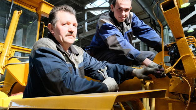Грозные грейдеры стоят на смотровых ямах. Опытный слесарь шестого разряда Алексей Морозов и его «подмастерье», молодой сотрудник Геннадий Савин уже поменяли колесо и установили новый гидравлический цилиндр на одной из машин. Теперь наставник показывает начинающему слесарю, на какие узлы и агрегаты нужно в первую очередь обратить внимание при подготовке техники, что подкрутить, что перепроверить.
