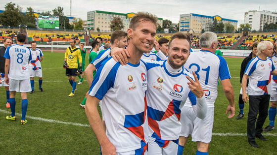 Необычный матч, который собрал на трибунах стадиона несколько тысяч любителей спорта и фанатов известных артистов и шоуменов, прошел в Гродно 16 сентября. Звезды успели не только забить и отбить по шесть голов, но и шутить, делать селфи, раздавать автографы и даже спеть гимн Беларуси. В этот день на поле вышли известные певцы, музыканты, спортсмены. За гостей играли Михаил Гребенщиков, Гарик Богомазов, Влад Топалов, Сергей Минский, Сергей Крылов, Александр Шевченко, Валерий Дайнеко и другие. Звездная команда пригласила в свой состав самого лучшего и известного белорусского футболиста XXI века Александра Глеба. Против знаменитостей вышла играть команда гродненских чиновников, которые в этот вечер сменили привычные костюмы и галстуки на спортивную форму. Возглавил команду гродненский мэр Мечислав Гой. С ним на поле вышли главный прокурор Гродно, заместитель главы Администрации одного из районов, руководители из местных горисполкома и облисполкома, а также представители спортивных организаций. Среди них — главный тренер гродненского футбольного клуба "Неман" Игорь Ковалевич и ветеран гродненского футбола Дмитрий Коваленок. Игра длилась около часа, но так и не показала, кто сильнее — чиновники или звезды. Матч закончился со счетом 6:6. По три гола команды забили в основное время, еще по три — во время серии пенальти. Звездный футбол открыл серию праздничных мероприятий, приуроченных к 889-летию Гродно, которое будет отмечаться 23 сентября. После игры звезды дали двухчасовой концерт прямо на стадионе.