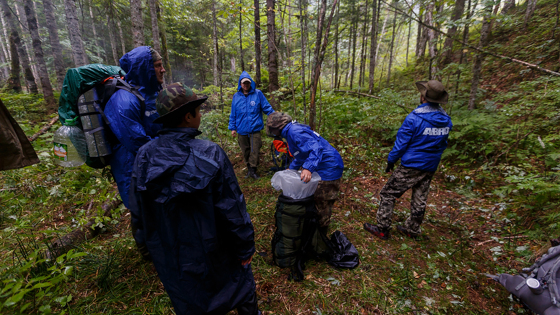 Текст: Дарья Червова, Вадим Шкодин Фото, видео: Александр Хитров Дорогой читатель! Настала пора рассказать о дне, когда произошли главные события в экспедиции PrimDiscovery на Аник. Делать это мы будем все вместе - Саша с помощью фотографий, Даша и Вадим - в совместном тексте. Почему выбран такой формат - скорее читайте и поймёте, будет интересно. *** Даша: "Оказаться так близко к цели и смириться с поражением? Добираться до горы пять суток и из-за дождя свернуть обратно, не дойдя всего 2,5 км? Ну нет, об этом и речи быть не могло. Мы уже находились на Анике, уже поднялись на высоту в 1000 метров, оставалось лишь забраться наверх. Вершина - вот она, совсем близко... А вместе с ней и родной Приморский край, ведь где-то на пике проходит граница субъектов. Сможем ли мы дойти? Дождь всё расходился. Наспех растянутый тент провисал и иногда давал течь, мокрая насквозь одежда мерзко прилипла к телу, стало холодно. Костя и Аня пытались дозвониться Лене, но связь прерывалась. Было понятно, что наш связной не слышит ни слова, а информация требовалась наиважнейшая - хотелось узнать, как долго в этих местах обещают дожди. - Лена, нам нужен прогноз погоды, - громко и чуть ли не по слогам выговаривал ее муж Костя, - в районе имени Лазо в Хабаровском крае. - Что?.. Костя... янмю... - Лена пыталась понять набор доходивших до нее звуков, но спутниковый телефон никак не мог справиться со слабым сигналом. - Прогноз север Приморья, перезвоним через 10 минут, - Костя не стал сдаваться. Мы отказывались верить, что зря расходуем дорогущие минуты спутниковой связи. Еще отказывались верить, что из-за ливня подняться на гору не получится. Каждая секунда неопределенности с погодой стала бесконечной. Мы стояли под тентом и смотрели друг на друга, повторяя одни и те же предположения и опасения. Паника нарастала. Спустя указанное время диалог Кости с женой повторился. Но то ли просвет между тучами образовался, то ли какие-то силы вмешались в процесс, но вдруг связь наладилась - Лена даже смогла разобрать несколько слов (как она потом рассказывала, это были слова "прогноз" и "Лазо"). Мы вновь обещали перезвонить и вновь стали ждать, а заодно с горем пополам развели костер и начали обниматься. По крайней мере, мы с Аней. Так теплее. Лена сообщила, что всю предстоящую неделю в этих краях будут лить дожди. Эта информация на несколько секунд нас даже оглушила. Все замолчали. Но затем Костя поблагодарил нашего дорогого синоптика, и понеслось обсуждение плана действий. Как бороться со стихией? Ждать у моря погоды смысла не было. Перспектива идти под холодным дождем не радовала. Ладно холод - когда идешь, становится даже жарко. Но вот мокрые коряги, курумы (валуны на склонах), скользкие и трухлявые пни, стланик... Иметь с ними дело не хотелось. Это очень опасно. К тому же на вершине гораздо морознее, могут быть и минусовые температуры... Про Болотную, куда мы тоже собирались зайти, вспомнили лишь вскользь: "Какая Болотная? И речи быть не может!". Да и неинтересно это - эти горы слишком близко находятся друг от друга, чтобы занимать два пункта проекта... Как девочки, мы с Аней не смогли себе позволить еще одного переохлаждения за последние три дня (после Чукена). И хотя душа разрывалась от выбора идти наверх по дождю или нет, я послушала голос разума. Ни одна вершина не стоит проблем с женским здоровьем. Конечно, и мужскому полез