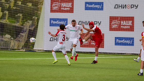 Матч был по-настоящему захватывающим! Начало первого тайма прошло относительно спокойно – игроки присматривались друг к другу, привыкали. Но уже к концу первого тайма обе команды забили по голу! Открыл счёт один из профессиональных футболистов, игравших за команду артистов НАШЕго Радио Аркадий Белый, а на последних минутах первого тайма счёт сравнял отважный слушатель Денис Шимко.