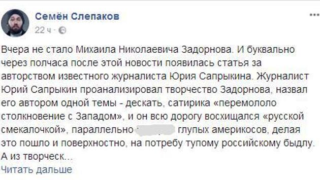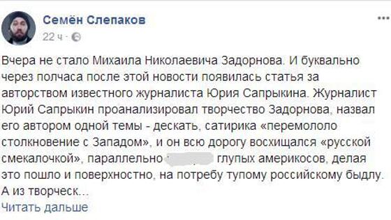 Автор юмористических песен Семен Слепаков остро отреагировал на статью Юрия Сапрыкина об ушедшем из жизни писателе-сатирике Михаиле Задорнове. Бард заявил, что журналист, раскритиковавший умершего, вряд ли способен понять его шутки. Сапрыкин назвал Задорнова автором одной темы. Его перемолола травма от столкновения с Западом, не военного, а психологического, шок от «выезда в загранпоездку». 100 сортов колбасы, улицы моют с шампунем, в подъездах чисто и лампочки горят, пишет журналист. По его словам, Задорнова восхищала «русская смекалочка», а американцы, фанатично следующие инструкциям, в его творчестве выглядели туповатыми («воо дураки-то»). А в заключение Сапрыкин вспоминает одну из старых шуток писателя. «Как пациент психбольницы представляет, что проходит собеседование в разведчики: «Вы владеете языком? — В совершенстве! — Будете наклеивать марки на конверты!» По мнению автора статьи, зарисовка очень похожа на краткое резюме всех «геополитических изысканий» Задорнова. На странице в Facebook Семен Слепаков похвалил Сапрыкина за оперативность. Молодец. Во-первых, оперативно. Во-вторых, хлестко, жестко и содержательно. Без всяких там соплей. Умер? Ну, на — лови! «Я не являюсь поклонником творчества Михаила Задорнова и никогда не участвовал в интернетовской полемике, но, как человек, занимающийся юмором, решил написать несколько строк, — продолжил автор песен. — Во-первых, Задорнов был реально крутым сатириком. Его концерты были событием, собиравшим у экранов всю страну и еще лет восемь назад, на сотом повторе, давали нефиговые рейтинги каналу Рен-ТВ. Он не был пошлым. Он был остроумным. У него была крутейшая подача. Он написал огромное количество качественного материала. Он очень сильно отличался от своих коллег-юмористов, чьих имен не буду произносить всуе». Слепаков считает, что на самом деле Задорнов троллил не американцев, а россиян — просто делал это так, чтобы нам не было обидно. «Американцам, конечно, тоже доставалось — тут Задорнов опять Сапрыкину не угодил — Америку же вообще трогать нельзя — это же священная корова, наша путеводная звезда», — иронизирует бард. Юморист подчеркнул, что Задорнов критиковал Запад в 90-х годах, когда Россия «страшно хотела» дружить с американцами, а они «весело … нам на голову». «Может быть, не из-за таких, как Задорнов у нас проблемы, а из-за того, что мы совсем не ценим того, что у нас появляется? Это же часть нашей культуры, как-никак. Не Гоголь, конечно, но рупор эпохи. Я как-то с трудом себе представляю, чтобы после смерти Джорджа Карлина в Америке вышла о нем подобная статья. Радует лишь то, что после смерти Юрия Сапрыкина вообще никакой статьи не выйдет, если он, конечно, не совершит самоподрыв в людном месте. Не дай Бог. Прошу прощения за резкость», — заключил Слепаков. Пост вызвал бурную реакцию пользователей Facebook. Комментаторы разделились на два лагеря: одни принялись вспоминать неудачные шутки Задорнова и обвинять Слепакова в глупости. Другие поблагодарили Слепакова за защиту умершего писателя. Писатель-сатирик Михаил Задорнов умер вечером 9 ноября. Последний год он лечился от опухоли мозга. По словам певца Иосифа Кобзона, у артиста были поражены оба полушария. За несколько дней до смерти Задорнов исповедался и соборовался.