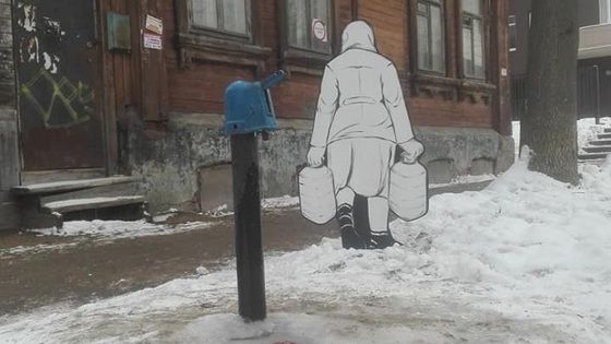 На улице Малой Ямской появился картонный силуэт женщины, которая тащит две пятилитровые бутылки. Кажется, что она вот-вот отошла от колонки с водой и теперь медленно, ворча и переваливаясь с ноги на ногу, несет свою ношу домой. Придумала эту бабулечку нижегородская художница Елена Лисица. «Недели три назад я гуляла по этой улице и увидела женщину, которая пожаловалась, что у них опять воды нет», — рассказала Елена. Немного переработав образ этой женщины Елена нарисовала ее силуэт на картоне. После чего установила его на том самом месте, где встретила вдохновившую ее бабулечку. «Мне хотелось обратить внимание на состояние улицы и на условия, в которых люди продолжают жить в век технологий. Ведра сменились бутылями, а больше ничего не поменялось. Воду на бытовые нужды приходится носить от колонки, — сетует художница. — Может быть, кто-то, увидев эту работу, придет домой и кран починит или забор поправит». «Кстати, колонка очень спасает, когда воду отключают у нас на улице Ошарская, 11а. А отключают ее постоянно», — написал на страничке Елены Сергей Сипатов. Напомним, нижегородцы слепили памятник Глебу Никитину из снега.