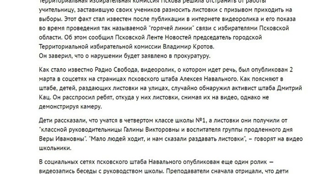 Юристы ассоциации «Гражданский контроль» обвинили авторов проекта «Карта нарушений» в некорректных формулировках избирательных споров, которые формируют у граждан несколько искаженное представление о ходе выборов президента России. В частности, авторы проекта публикуют на своей «карте» нарушения, подтвержденные лишь заметками в СМИ, а то и откровенными домыслами. Никакой официальной реакции — ответов уполномоченных органов, полученных представителями проекта — на «Карте нарушений» практически не представлено. Школьники — «агитаторы» В качестве одного из примеров эксперты приводят сообщение из Пскова, согласно которому местная территориальная избирательная комиссия якобы решила отстранить от работы учительницу, заставлявшую своих учеников раздавать уличным прохожим листовки с призывом приходить на выборы. «Сообщение приводится с двойным цитированием — „Радио Свобода“ ссылается на сообщение „Псковской Ленты Новостей“. Возникает сомнение, что модераторами сайта была получена какая-либо официальная реакция и они вообще принимали участие в предметной проработке данного вопроса», — недоумевают эксперты из «Гражданского контроля». «Кроме того, данная проблема маркирована как „Административный ресурс/Давление начальства на избирателей“. При первичном анализе речь может идти о принудительном привлечении к информационно-разъяснительной работе учеников, не обладающих активным избирательным правом, то есть о личном злоупотреблении своими положением со стороны члена УИК, не занимающего каких-либо административных должностей (педагог школы). Производимые действия сами по себе никак не связаны с „давлением на избирателей“, тем более в интересах конкретного кандидата или партии. Также без должных оснований администраторами портала широко применяется маркер „Административный ресурс/Использование бюджетных ресурсов“», — говорится в сообщении ассоциации. «Нарушение» на будущем избирательном участке Еще одним сомнительным «нарушением», опубликованным на сайте проекта, эксперты назвали информацию из Набережных Челнов. Учитель истории одной из городских школ Раушан Валиуллин пожаловался в прокуратуру на висящий в образовательном учреждении портрет действующего президента Владимира Путина, который, как известно, хочет быть избранным на новый срок. По мнению Валиуллина, наличие портрета главы государства в школе — это агитация на территории избирательного участка, что запрещено законодательством РФ. На жалобу педагога отреагировал глава ЦИК РТ Мидхат Шагиахметов. Он заявил, что размещение в отдельных учебных заведениях портретов президента не могут, согласно закону, рассматриваться как предвыборная агитация. Сам факт опубликованного ответа позволяет говорить о том, что со стороны прокуратуры и избирательной комиссии было своевременное реагирование на обращение гражданина. Запрашиваемое разъяснение было получено и по смыслу данных разъяснений факт нарушения требований законодательства установлен не был. Однако сообщение промаркировано как «Нарушение правил уличной и наружной агитации», «Административный ресурс/Использование бюджетных ресурсов» исключительно в силу личной убежденности заявителя в неправильности позиции уполномоченного органа, давшего разъяснение,полагают юристы.