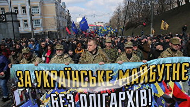 «Антиолигархический марш», шумно анонсированный на 3 апреля в украинской столице «Национальным корпусом», «Свободой»*, «Правым сектором»* и С14 (основные силы на ультраправом поле), не был по-настоящему многочисленным. Это и понятно — социальная повестка целевой аудитории этих сил не очень близка и понятна, поэтому все прошлые попытки националистов играть на этом поле (поддерживая шахтеров или протестуя против экспорта леса-кругляка) были достаточно скромны в плане мобилизации активистов. На этот раз, впрочем, на улицы дружными консолидированными усилиями удалось вывести около 2 тысяч человек. Антиолигархическая повестка, заявленная еще в подписанном 15 марта 2016 года перечисленными выше организациями «Национальном манифесте», смотрится не очень органично хотя бы потому, что еще несколько лет назад те же самые националисты были очень тесно связаны с яростно крикуемыми ими ныне олигархами. Достаточно вспомнить, как ставший губернатором Днепропетровской области Игорь Коломойский превратил город в «столицу украинского национализма», куда де-факто перебазировался «Правый сектор» во главе с Дмитрием Ярошем. Деньги Коломойского тогда щедро питали и «Азов», о чем в августе 2014 года откровенно напомнил его заместитель на посту губернатора Борис Филатов, к которому тогда приехал для подтверждения лояльности «азовский» комбат, а ныне гордый вождь «Национального корпуса» Андрей Билецкий. Во время парламентских выборов 2012 года Коломойского называли спонсором «Свободы», которая единственный раз тогда прошла в Раду. Акция протеста в Киеве против олигархов О правлении Коломойского и его бизнес-партнеров в Днепре националисты, получившие тогда карт-бланш на насилие и внутри региона, сейчас вспоминают с ностальгией. Дарья Слуцковская, заместитель руководителя Днепропетровского областного отделения «Национального корпуса», а в 2014-м активистка местного «Правого сектора», 22 марта в своем видеообращении рассказала: «Почему в Днепре этого (народных республик. — Прим. авт.) не случилось? Потому что на тот момент Игорь Валерьевич (Коломойский. — Прим. авт.) и Геннадий Олегович (Корбан. — Прим. авт.) возглавили область… Был Геннадий Олегович, который был достаточно жесткий, который вызвал начальство (на тот момент) милиции областной и городской, и сказал — ребята, если здесь будет какая-то сепарская движуха, и вы будете как-то им помогать, и мешать патриотично настроенным гражданам, то вы, ребята, поедете в АТО, и вы будете там на блокпостах, на базах сидеть по подвалам. Я все это прекрасно помню, это не забудется никогда… Как вывозили (очевидно, в лес или в другие удобные места. — Прим. авт.) мэров, как вывозили милицию, да кого только не вывозили, и им объясняли — нет, забудьте вообще слово «Россия», забудьте, «чемодан, вокзал, Москва», только так можете его употреблять». Сейчас же, жалуется Слуцковская, силовики ведут себя неправильно, даже… вывозят в лес? нет, просто иногда достаточно цивилизованно проводят у националистов обыски (которые те транслируют в соцсети) и вынуждают их выходить на уличные акции протеста. Зато с Коломойским и Корбаном у «правосеков» (в рядах которых числились тогда и будущие активисты «Национального корпуса») были взаимные любовь и понимание. Самым настоящим олигархом был и Арсен Аваков, ставший после победы Евро