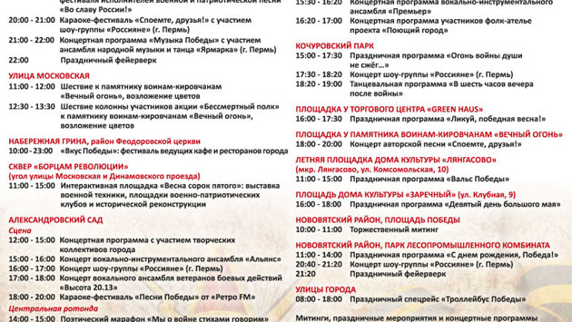 Как рассказали сегодня участники пресс-конференции, посвященной вопросам подготовки к празднованию Дня Победы, с 24 апреля в городе Кирове стартует акция «Георгиевская ленточка». С 3 мая начнутся мероприятия в домах культуры – они откроются городским торжественным вечером в ДК «Космос». 8 мая, с 16.00, в сквере Борцам революции состоится традиционная студенческая мемориальная акция «Линейка памятки». 9 мая, с 14.00, на Театральной площади начнутся концертные программы. В 15.30 откроется фестиваль духовых оркестров, который проводится в этом году впервые. В фестивале примут участие детские коллективы «Ретро», «Авангард» и военный оркестр «Северная звезда». Перед вечерним фейерверком на главной городской площади выступит творческий коллектив из Перми – ансамбль песни и танца «Ярмарка» с программой «Музыка Победы». В Александровском саду также впервые состоится поэтический марафон «Мы о войне стихами говорим», к участию в котором привлекут детские творческие коллективы. Начальник управления культуры Марина Исупова уточнила, что праздничные программы пройдут на всех городских площадках, в том числе на новой – у ТЦ «Грин Хаус», с 16.00. 9 мая, в 10.00, на набережной Грина начнется уже полюбившийся жителям и гостям города фестиваль «Вкус Победы». «Начиная от Феодоровской церкви и до Старого моста будет размещено 10 празднично оформленных шатров от ведущих кафе и ресторанов, которые предоставят лучшие блюда своей кухни, – сообщил начальник управления развития предпринимательства и потребительского рынка Александр Седельников. – Планируются социальные акции для ветеранов Великой Отечественной войны. На отдельной сцене пройдут мероприятия для детей, мастер-классы, а вечером мы планируем выступления рок-коллективов. Параллельно между предприятиями общественного питания состоится конкурс, выберем лучших». Вечером кировчан ждет фейерверк: в 21.20 в парке ЛПК Нововятского района и в 22.00 на Театральной площади. Фото – admkirov.ru