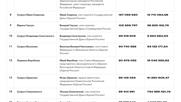 Самой богатой по результатам 2017 года стала жена депутата Госдумы Александра Некрасова Елена Некрасова. Второй год подряд она лидирует в этом рейтинге, ее доход за 2016 год превысил 2 млрд рублей. Елене Некрасовой удалось заработать в 78 раз больше, чем ее супругу. Она владеет несколькими компаниями, входящими в строительный холдинг «Лидер Групп». Со второго места Людмилу Воробьеву, супругу заместителя председателя Совета Федерации и соратника Сергея Шойгу Юрия Воробьева, сместила жена депутата Дмитрия Саблина Алла Саблина. Она поднялась с восьмого места на второе, заработав почти в шесть раз больше, чем в предыдущем году. В ее собственности числится шесть квартир общей площадью 512,6 кв. м. Сама же Людмила Воробьева опустилась на 12 позицию, ее доход сократился почти в три раза и составил 91 млн рублей. Третье место досталось новичку в рейтинге — супруге члена комитета Госдумы Алексея Красноштанова. За год она заработала на 668,8 млн рублей больше (в 2016 году она задекларировала доход в размере 1,6 млн рублей, а в 2017 он составил 670,4 млн рублей). Впервые в рейтинг вошли жены депутатов Госдумы Рахима Азимова и Алексея Веллера. За год доход супруги Веллера увеличился в десятки раз — если в 2016 она заработала около 250 тысяч рублей, то в 2017 году уже 52,1 млн рублей. Супруга Азимова за это время увеличила свой заработок больше, чем в семь раз, она задекларировала 66 млн рублей. Из списка выбыли супруга Владимира Бочкова — в 2017 году ее доход сократился почти в четыре раза, супруга Юрия Волкова (почти в шесть раз) и Антона Жаркова (почти в три раза). В нынешнем списке есть и представительницы, которые из года в год попадают в рейтинг богатейших жен. Например, супруга депутата Госдумы Андрея Чернышева уже была в нашем списке в 2017 году — тогда она заняла девятое место, но теперь опустилась на четыре позиции ниже: если за 2016 год она заработала 123,5 млн рублей, то в 2017 ее доход составил 77,9 млн рублей. Общий доход вошедших в список жен составил почти 6 млрд рублей. Подавляющее большинство — это жены депутатов Государственной думы от партии «Единая Россия». В рейтинг также вошли супруги министров и только одна жена сотрудника Администрации президента, пресс-секретаря президента Дмитрия Пескова — фигуристка Татьяна Навка, которая за год заработала почти в 14 раз больше самого Пескова. При подготовке рейтинга мы использовали данные из опубликованных деклараций сотрудников Администрации президента, членов Кабинета министров РФ, Совета Федерации и депутатов Государственной думы за 2017 год. В наш список вошли супруги чиновников, чей годовой доход превысил 50 млн рублей. При составлении рейтинга принимались во внимание только личные доходы женщин без учета заработка их мужей и детей. Читайте также Прекрасный квартет. Чем известны женщины нового правительства Высокая должность требует жертв: правила жизни Валентины Матвиенко