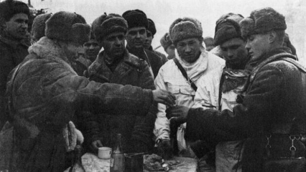 Правило выдачи бойцам «наркомовских 100 грамм» было введено ещё во время Финской войны. Насчет же того, какая норма спиртного полагалась солдатам Рабоче-крестьянской Красной Армии на фронтах Великой Отечественной войны существуют разные сведения, часто опровергающие друг друга. Когда стали наливать? Когда же в русской армии начали «наливать»? Эта традиция идет ещё с петровских времен, когда солдатам для поднятия боевого духа стали раздавать так называемое хлебное вино. До 1908 года во время военных действий нижние чины действующей армии получали по три чарки (160 граммов) водки в неделю, нестроевые - по две чарки. Годовая норма выдачи водки в праздничные дни равнялась 15 чаркам. Кроме того, офицер мог награждать отличившихся бойцов за свой счет. С началом Первой мировой войны в Российской империи был введен сухой закон, но моряки по-прежнему получали «винную порцию». Наркомовские 100 грамм Впервые «наркомовские 100 грамм» были утверждены в январе 1940 года во время Финской войны. Авторство этой идеи принадлежит Клименту Ворошилову. Именно он предложил Сталину издать распоряжение о ежедневной выдаче бойцам Красной Армии 50 граммов сала («ворошиловский паек») и 100 граммов водки ("наркомовские 100 грамм"). Норма танкистов была удвоена, а летчикам, как элите вооруженных сил, полагалось по 100 граммов коньяка. С 10 января по начало марта 1940 года военнослужащими Рабоче-крестьянской Красной Армии было выпито более 10 тонн водки и 8,8 тонны коньяка. «Водочные постановления» Нормы выдачи водки красноармейцам и командующему составу за время Великой Отечественной войны менялись несколько раз. Первое постановление ГКО за номером 562сс вышло 22 августа 1941 года. В нем говорилось: «Установить, начиная с 1 сентября 1941 года, выдачу 40° водки в количестве 100 граммов в день на человека красноармейцу и начальствующему составу войск первой линии действующей армии». 25 августа последовал уточняющий приказ «О выдаче военнослужащим передовой линии действующей армии водки по 100 граммов в день». Там было сказано о том, что боевые летчики и инженерно-технический состав аэродромов должны получать водку в тех же объемах, что и бойцы Красной Армии, сражавшиеся на передовой. С 6 июня 1942 года новым постановлением Верховного главнокомандующего всеобщая выдача водки в Красной Армии была прекращена. Сталин сам внес правки в проект постановления, подготовленный ещё 11 мая. Теперь водку давали только тем военнослужащим, которые участвовали в наступательных операциях. Остальным наливали только по праздникам. Показательно, что из списка праздников, в которые военнослужащим разрешалось принять на грудь, Сталин лично вычеркнул Международный юношеский день. 12 ноября 1942 года правило "100 грамм" вновь ввели для тех, кто участвовал в боевых действиях на передовой. Резервным войскам, бойцам стройбата, работавшим под огнем противника и раненым (если разрешали врачи) предписывалось выдавать по 50 граммов водки в день. На Закавказском фронте вместо 100 граммов водки давали по 200 граммов портвейна или 300 граммов сухого вина. Уже 30 апреля 1943 года вышло новое постановление ГКО № 3272 «О порядке выдачи водки войскам действующей армии». Согласно приказу, с 1 мая текущего года выдача водки личному составу прекращалась, 100 граммов полагалось теперь лишь бойцам передовой, участвующим в наступательных о