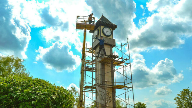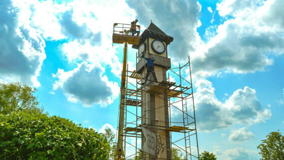Три столетия назад тогда еще в небольшом местечке Могилевской губернии открыли часовую фабрику. Говорят, что она стала первой в России. И если с этим историки готовы спорить, то насчет того, что местные мастера были лучшими, сомнений нет. Башенные часы для Дубровно - напоминание: местным жителям есть чем гордиться, считает глава Дубровенского района Олег Лындин: - Проект стоимостью более 40 тысяч белорусских рублей воплотили в жизнь за спонсорский счет. Основную часть средств перечислил льнозавод, сваркой каркаса занимался райагросервис, не остались в стороне такие сельхозпредприятия, как имени Черняховского, "Команина", "Правда-С" и другие. Мы побывали в Дубровно, когда дело шло к финишной прямой. На конструкцию высотой без малого с пятиэтажку собирались устанавливать медный флюгер. На нем - цифра "1393", дата первого упоминания о местечке в летописях. Исторический ликбез есть и на дверце щитка, закрывающего сердце механизма, показывает Роман Саможенов, директор предприятия ЖКХ. Именно "Дубровно-Коммунальник" стал хозяином местного "Биг-Бена" и теперь в ответе за точное время в райцентре: - Фундамент мачты (а по документам башня проходит именно так. - Авт.) залили на республиканском субботнике, - рассказывает Роман Леонидович. - Четыре пары часов (на каждую сторону башни) приехали к нам из Москвы. Их диаметр - метр, а точность до миллисекунды. Изготовить устройство, но за совсем другие деньги, также предлагали частники из Санкт-Петербурга и Минска. Крупный отечественный производитель - Минский часовой завод - в тендере не участвовал: подобные часы он сейчас не выпускает. Механизм запрограммирован отслеживать время через GPS-приемник. Ходу стрелок не повредит даже ЧП с электричеством. "Тикать" в штатном режиме от недели до месяца позволит специальная аккумуляторная батарея. Самым сложным было смонтировать громоздкий механизм на высоте. Тут пригодились золотые руки коммунальников Олега Никитенко и Сергея Титова. К юбилею дубровенцы ждут и открытия краеведческого музея. Домом для него стало здание бывшего магазина. Наталья Овчарова, хранитель фондов рабочей группы по созданию музея, заверила, среди экспонатов есть и необычные часы, на которые определенно стоит взглянуть. В свою очередь, хронометры с белорусскими корнями отыскали и в фондах Эрмитажа. На циферблате одного из них стоит надпись: "Фабрика Дубровенская".