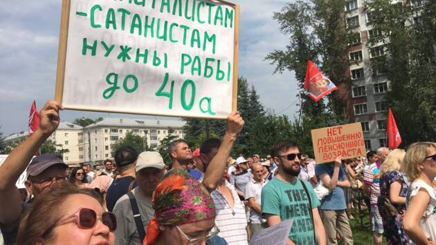 Казань присоединилась ко всероссийской акции КПРФ против повышения пенсионного возраста. Предварительно были разосланы приглашения всем 15 депутатам Госдумы от Татарстана, голосовавшим 19 июля за скандальный законопроект. Правда, никто из них на митинг так и не пришел. Выступающие еще раз напомнили о существовании у КПРФ программ по выводу страны из кризиса, зачитали конкретные предложения. По подсчетам организаторов удалось собрать около 2 тысяч подписей против повышения пенсионного возраста. — Который час? — женщина лет семидесяти обратилась к трем молодым людям, стоявшим у фонтана в сквере имени Тинчурина, где сегодня в 10 часов утра должен был начаться митинг против повышения пенсионного возраста.— Эх, всего 20 минут осталось, а собралось… Сколько здесь народу? Человек сто? Вы сами-то на митинг идете? Маловато нас. Было бы больше, власти бы сразу пошли на попятную. Боятся они народа, — раздосадовано проговорила пенсионерка, махнула рукой и отошла в тенек. В это время возле фонтана на огороженной железным забором территории вовсю кипела работа. Организаторы спешно устанавливали микрофоны с колонками, делали рамки для плакатов, которые чуть позже разложили на газоны. Солнце палило нещадно. Казанцы, скрывавшиеся от палящего зноя в тени деревьев, стали не спеша подходить к входу на площадку, привычно показывая содержимое сумок полиции. Тут как нельзя пригодилась газета «Правда», которую раздавали волонтеры. Свежую прессу тут же приспособили под головные уборы, защищающие от июльского зноя. Появились и первые плакаты: «Капиталистам-сатанистам нужны рабы до 40», «Помоги государству! Умри до пенсии!», «Нет повышению пенсионного возраста — и точка!», «Медведев и Путин, хватит дурить и грабить народ!». Туда-сюда по площадке ходил завсегдатай всех коммунистических митингов – мужчина с гипсовым бюстом Ленина в одной руке и портретом Сталина в другой. Появился и еще один человек-мем, барабанщик — тот самый энтузиаст, который сопровождает барабанным боем все митинги против строительства мусоросжигательного завода под Казанью и многие другие акции оппозиции. Правда, прежде чем зазвучала барабанная дробь организаторы включили запись слов Владимира Путина о нецелесообразности повышения пенсионного возраста. После этого из динамиков послышалась ставшая уже знаменитой песня Семена Слепакова «Обращение к народу», естественно, посвященная Дмитрию Медведеву. «Хорошего вам настроения, вы держитесь здесь, просто денег нет!», — исполнитель вынес в припев уже ставшие классикой слова российского премьера. «МЕДВЕДЕВ СО СВОИМ ПРАВИТЕЛЬСТВОМ… ЗАБИЛ ГОЛ ПО ВСЕЙ РОССИИ» Перед самым началом митинга у фонтана появились фотографии всех 15 депутатов Государственной Думы от Татарстана, которые 19 июля в первом чтении поддержали законопроект о повышении пенсионного возраста. Напомним, предполагается, что для мужчин он повысится до 65 лет, для женщин — до 63 лет. — Сегодня мы здесь собрались в рамках всероссийской акции. Она проходит более чем в 100 городах России, во всех крупных областных и региональных центрах от Владивостока до Калининграда. Помимо Казани, подобная акция будет проходить в таких городах Татарстана, как Набережные Челны, Альметьевск, Заинск и так далее, — открыл митинг депутат Казгордумы Алексей Серов и передал слово первому с