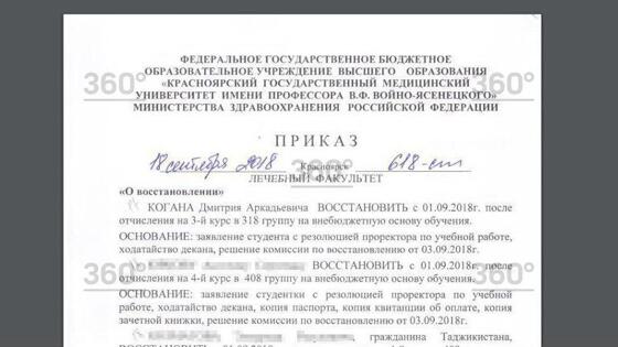Красноярец Дмитрий Коган, сбивший насмерть двух девушек в 2014 году в центре города, восстановился в медицинском университете. За него походатайствовал лично декан лечебного факультета. Копия приказа о восстановлении Когана оказалась в распоряжении редакции «360». Он продолжит учиться на врача на «внебюджетной», то есть, платной основе. Источник фото: телеканал «360» Авария произошла 2 августа 2014 года. 19-летний студент, сын известного в Красноярске врача, руководителя городской больницы скорой помощи Аркадия Когана, превысил скорость, проехал на красный сигнал светофора и сбил двух девушек прямо на пешеходном переходе. Они погибли на месте. Источник фото: телеканал «360» После многочисленных экспертиз, суд признал Дмитрия Когана виновным и отправил его на три года в колонию-поселение. Осужденный был освобожден досрочно через год и два месяца. Родители девушек получили по суду компенсацию 1,5 миллиона морального ущерба, хотя они требовали три миллиона. Дело получило огромный резонанс в Красноярске. Горожане выходили на митинг, требуя не затягивать расследование и суд, которые продолжались больше года.