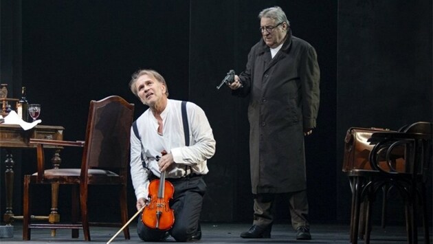 Автор пьесы, Дидье Карон, в молодости собирался сделать карьеру в банковском деле, но, проработав некоторое время простым клерком, убедился в том, что финансы стихия для него слишком прозаическая. И рванул в актёры. Но, видимо, способности к управлению потоками (пусть и не денежными) у г-на Карона всё-таки имелись и начинающий актёр довольно быстро увлёкся сначала драматургией, а затем и режиссурой, причём, не только театральной. "Фальшивая нота" была написана Кароном в прошлом году, и сразу же поставлена им в одном из старейших театров Парижа – "Мишель", которым драматург руководит вот уже добрый десяток лет. Премьера в Вахтанговском получилась, можно сказать, тройной: и для самой пьесы, и для её автора, которого у нас до сих пор пока не ставили, и для Геннадия Хазанова, впервые вышедшего на сцену прославленного академического театра. Фото: Театр им. Евгения Вахтангова Карон, имеющий у себя на родине репутацию добротного комедиографа, начинает эту историю как фарс: после концерта в гримёрку знаменитого дирижёра с "музыкальной" фамилией Миллер, мечтающего только о том, чтобы все его оставили в покое, вваливается настырный поклонник его таланта Динкель – тюфяк, недотёпа, да ещё и скрипач-любитель в придачу. Своего тонкого, эстетствующего почти-что-гения Алексей Гуськов, словно букет по веточке, составляет из черт многих выдающихся дирижёров – от Тосканини до Бернстайна, и от Светланова до Гергиева. Вторжение прозаического мира в свои эмпиреи маэстро раздражают донельзя. Он и так недоволен всем и вся – концертом, оркестром, особенно первой скрипкой, но более всего, кажется, самим собой, хотя причина этого недовольства зрителю откроется далеко не сразу. Суетливый же горе-меломан требует от него и автограф, и фотографию, и внимания к своей скромной персоне – он ведь ради этого концерта из Бельгии приехал! Хазанов выписывает своего героя так, что на ум поневоле приходят полотна Босха и Брейгея. Но чем явственней гротеск, тем сильнее ощущение, что вся эта бестолковая, почти карнавальная кутерьма маскирует нечто очень страшное, как зелёные ветви скрывают от хищника глубокую ловушку, которой ему не удастся избежать. Фото: Театр им. Евгения Вахтангова Впрочем, у охотника и самого трясутся поджилки, ведь ружьё (простите, пистолет) он, кажется, держит в руках впервые. Мсье Динкель вынашивал план мести практически всю свою жизнь. Но в мыслях наказать виновного гораздо легче, чем осуществить это на практике. И вот эти мучительные колебания мирного обывателя, который в своей жизни, в отличие от своего врага, не то что звёзд с неба никогда не хватал, но вообще не совершил ни одного решительного поступка, Хазанов передает с абсолютно беспощадной точностью. Ведь убийца, которого этот горе-мститель мечтает призвать к ответу, как ни крути – живой человек. Этим, в общем-то, мсье Динкель, который на самом деле оказывается Динкельштейном, и отличается от герра Кейтеля, спрятавшегося за фамилией Миллер, украденной им у человека, сгинувшего в печах Аушвица. Фото: Театр им. Евгения Вахтангова Сценография Адомаса Яцовскиса предельно метафорична. Под колосниками парит платформа, где между пустых пюпитров и стульев ещё кружат заблудившиеся звуки. В партитуру, придуманную для спектакля Фаустасом Латенасом, помимо его собственной музыки, вплетены произведения Ва