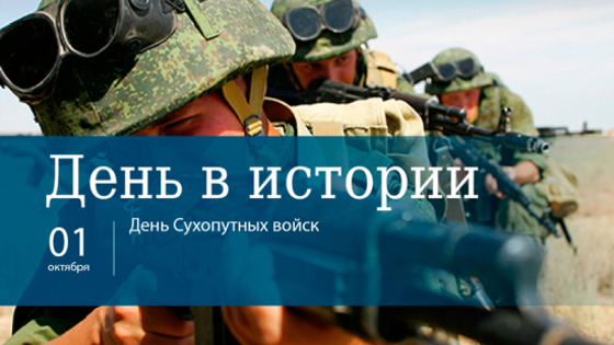 День Сухопутных войск. Памятный день Вооруженных сил России, установленный указом Президента РФ «Об установлении профессиональных праздников и памятных дней в Вооруженных силах Российской Федерации» от 31 мая 2006 года. 1 октября 1550 года царь Иван IV Грозный издал указ «Об испомещении в Московском и окружающих уездах избранной тысячи служилых людей», тем самым заложив основы первого постоянного войска. В соответствии с указом были созданы «огнестрельная пехота» (стрелецкие полки) и постоянная сторожевая служба. Современные Сухопутные войска — наиболее многочисленный и разнообразный по вооружению и способам боевых действий вид Вооруженных Сил РФ, которые предназначены для отражения агрессии противника на континентальных театрах военных действий, защиты территориальной целостности и национальных интересов РФ. Они оснащены танками Т-72, Т-80, Т-90, реактивными системами залпового огня «Град», «Ураган», «Смерч», ракетными комплексами «Хризантема-С», «Фагот», «Точка-У», зенитными ракетными системами «Тор-M1» и «С-300В», зенитными ракетными комплексами «Бук-М1», «ОСА-АКМ», «Тор-М2У» и другой военной техникой. День пожилых людей. Учрежден постановлением Президиума Верховного совета РФ от 1 июня 1992 года. В этот день проходят праздничные концерты, работают «горячие линии» по вопросам оказания помощи пенсионерам и предоставления им санитарно-курортного лечения, а также проводятся бесплатные консультации врачей. В России, по данным Росстата, проживают свыше 30 миллионов лиц старше 60 лет. По прогнозам Минтруда РФ, доля граждан пенсионного возраста к 2025 году увеличится до 27% и составит порядка 40 миллионов человек. Международный день пожилых людей. Памятная дата ООН, установленная резолюцией Генеральной Ассамблеи организации в 1990 году. Его цель — привлечь внимание мировой общественности к проблемам людей пожилого возраста. По данным ООН, в настоящее время в мире насчитывается около 700 миллионов человек старше 60 лет. К 2050 году число пожилых людей достигнет двух миллиардов и составит более 20% мирового населения. Всемирный день Хабитат. Памятная дата ООН, установленная резолюцией Генеральной Ассамблеи организации 17 декабря 1985 года. Отмечается в первый понедельник октября. Цель праздника, название которого происходит от французского «habitat» («жилище»), привлечь внимание к состоянию городов, напомнить о праве каждого человека на достойное жилье и о коллективной ответственности за будущее городской среды. С 1985 года в этот день вручается «Всемирная премия Хабитат». Она присуждается за новаторские и практичные проекты, направленные на удовлетворение потребностей в жилье. Международный день музыки. Учрежден в 1973 году по инициативе Международного музыкального совета при ЮНЕСКО для распространения музыкального искусства во всех слоях общества и развития культур, обмена опытом и взаимного уважительного отношения к эстетическим ценностям. Впервые День музыки отмечался 1 октября 1975 года. 15 лет назад (2003) начала свою деятельность компания «Российские железные дороги» (РЖД). Согласно постановлению Правительства РФ компании были переданы функции управления железнодорожным транспортом упраздняемого Министерства путей сообщения. Единственным акционером РЖД является Российская Федерация. «Российские железные дороги» — основной владелец и о