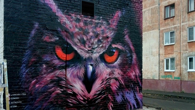 Над совой творческие новодвинцы трудились два дня — в холоде и дожде Новодвинцы Кирилл Лебедев и Александр Алексеев сделали трансформаторную подстанцию в одном из дворов города — на улице Советов, 5а — основой для крупного и яркого арт-объекта. На стене подстанции появилось большое граффити с совой. Рисовали молодые люди два дня при суровых погодных условиях, но с задачей справились — и теперь в планах новые украшения городских пространств, рассказал 29.ru Кирилл Лебедев. — Было очень холодно, шёл дождь — погода была ужасной, но мы справились. Идея нарисовать сову пришла ко мне давно, реализовать её удалось в проекте «Давайте раскрасим Новодвинск». Локация на Советов выбрана организаторами проекта. Рисунок мы сделали вдвоем, с моим другом Александром Алексеевым. Крупные граффити определенно еще будут. Прямо сейчас я уже работаю над эскизом к новому изображению, но где его нанесу, пока не определился, — пояснил Кирилл. Изображение совы выполнено в лиловых, красных и розовых тонах на затонированном черным цветом фоне, что придает ей угрожающий, но притягивающий взгляд любого прохожего вид. По его словам, Новодвинск также украсят граффити на других трансформаторных подстанциях от архангельских художников: они изобразят дельфинов и перенесут в уличное пространство одно из полотен Анри Матисса. Отметим, что для Новодвинска — это первый большой опыт преобразования облика с помощью художников, работающих в направлении стрит-арт. Но есть возможность взять пример у Архангельска и Северодвинска. Так, в августе в Северодвинске тоже появилось изображение совы, правда, расположился рисунок на стене дома в пять этажей. А в Архангельске своими работами уличные художники часто радуют прохожих и посетителей музея ИЗО — там часто появляются новые изображения по мотивам картин известных художников.