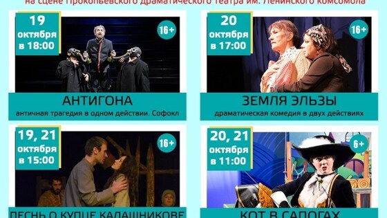В рамках гастрольного тура прокопьевская труппа сыграет 5 спектаклей: "Барышня-крестьянка" по известнейшей "повести Белкина" А.С. Пушкина, комедию положений В. Шкваркина "Чужой ребенок", "Коломбина, Бригелла и другие" по итальянской "комедии масок", современную фантастику " Киборг, I love you!" и трогательную историю о старшем поколении кузбассцев "Хорошие новости". Сцена из спектакля "Киборг, I love you!". Фото: pteatr.ru Тур завершится 20 октября 2018 года. Прокопьевский драматический театр основан в 1945 году. В настоящее время является лауреатом национальной театральной премии "Золотая Маска". Для театра характерна широта репертуарных интересов — от традиционной классики до вызывающей современности, позволяющая труппе с успехом выступать на фестивалях разной направленности. В программе гастролей: 19 октября в 10:00 – Спектакль "Коломбина, Бригелла и другие" 19 октября в 13:00 – Спектакль "Барышня-крестьянка" 19 октября в 18:30 – Спектакль "Киборг, I love you!" 20 октября в 12:00 – Спектакль "Коломбина, Бригелла и другие" 20 октября в 17:00 – Спектакль "Хорошие новости" Сцена из спектакля "Коломбина, Бригелла и другие". Фото: pteatr.ru С 19 по 21 октября 2018 года жители Прокопьевска будут знакомиться с репертуаром Русского драматического театра им. Лермонтова на сцене Прокопьевского драмтеатра им. Ленинского комсомола. В гастрольном репертуаре абаканцев также пять постановок: семейная драма "Земля Эльзы" по пьесе Я. Пулинович и комедия "Детектор лжи" по пьесе В. Сигарева, оба спектакля – работы режиссера Евгения Ланцова. Абаканцы затронули историческую тему: они покажут театралам Прокопьевска "театральный урок" режиссера Владимира Гордеева "Песнь о купце Калашникове" для учеников старших классов и знаменитую античную трагедию Софокла "Антигона", но в собственной сценической версии. Самым маленьким зрителям привезли сказку всех поколений "Кот в сапогах". "Антигона" – 19 октября в 18:00. "Песнь о купце Калашникове" – 19 и 21 октября в 15:00. "Земля Эльзы" – 20 октября в 17:00. "Кот в сапогах" – 20 и 21 октября в 11:00. "Детектор лжи" – 21 октября в 17:00.