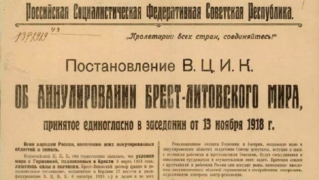 13 ноября 1918 года Всероссийский Центральный исполнительный комитет (ВЦИК) аннулировал Брестский мир с Германией. Эксперты называют этот момент поворотным в Гражданской войне. Правительства стран — членов Антанты, осуществлявших интервенцию в Россию, не смогли объяснить своим солдатам, зачем они должны воевать против большевиков. При этом советские агитаторы добились резкого роста популярности левых идей как в войсках Антанты, так и среди отступающих германских военных. Первая мировая война легла тяжёлым социально-экономическим бременем на большинство из участвующих в ней стран. Россия не была исключением. Подорванная экономика в тылу, затяжной характер боевых действий и отсутствие ярких побед стали важными факторами, способствующими возникновению в России революционной ситуации. Временное правительство, пришедшее к власти в стране по результатам Февральской революции, не сумело разрешить основные проблемы, волновавшие общество. Им на смену пришли большевики, совершившие новую, Октябрьскую революцию. Изданный ими Декрет о мире призывал к переговорам между участниками войны без аннексий и контрибуций. Эту идею готовы были поддержать Центральные державы, для которых ход боевых действий становился уже катастрофическим. Но страны-члены Антанты мириться с противником на таких условиях не желали. Брестский мир В ноябре 1917 года между Великобританией и Францией начались переговоры об интервенции в Россию и разделе её на зоны влияния. В декабре Лондон и Париж договорились, что Великобритании отойдут Кавказ и Средняя Азия, на которые та претендовала ещё в XIX веке, а Франции — Крым, Украина, Новороссия и Бессарабия. Договориться о сотрудничестве с Советами попытались Соединённые Штаты Америки, но под давлением Лондона и Парижа Вашингтон отказался от этой идеи. Большевики в это время вели сложные переговоры о мире с представителями Германии. В Берлине прекрасно осознавали всю сложность внутреннего положения в России, стоявшей на пороге масштабной гражданской войны, и поэтому на «мир без аннексий и контрибуций» тоже были не согласны. Сначала возникла дискуссия о статусе Польши и Прибалтики, а затем немцы воспользовались стремлением участвовать в обсуждении условий мира представителей Украинской Центральной Рады и при помощи дипломатических хитростей сделали их стороной переговорного процесса. В итоге в феврале — марте 1918 года, тесня Красную гвардию на фронте и используя как прикрытие на переговорах делегацию Украинской Народной Республики, Германия смогла навязать Советской России условия, как выразился Владимир Ленин, «похабного» мира. Россия теряла Прибалтику, Украину, земли в Белоруссии и на Кавказе, а также ряд военных баз на Балтийском море. Кроме того, большевики должны были выплатить Германии репарации в размере 6 млрд марок и компенсации в объёме 500 млн рублей. Германские и австро-венгерские войска не только оккупировали Украину и часть Белоруссии, но на ряде участков даже перешли границы, обозначенные их командованием в ходе брестских переговоров. Однако Россия весной 1918 года была ещё слишком слаба, чтобы противопоставить что-то военной машине Берлина. Оккупировавшие Украину и Новороссию, немцы сразу же забыли о своих обязательствах перед «союзниками» из Украинской Народной Республики и организовали 
