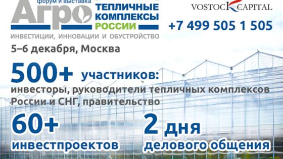 Дата: 5-6 декабря 2018 года Место: Москва, отель «Балчуг Кемпински» Организатор: Vostock Capital Официальный сайт: https://www.greenhousesforum.com/ 3-й ежегодный международный инвестиционный форум и выставка «Тепличные комплексы России 2018» – престижная профессиональная международная площадка для привлечения инвестиций в тепличную отрасль России, обсуждения стратегий развития индустрии, обмена опытом между ключевыми игроками рынка и заключения новых взаимовыгодных контрактов. Тепличные комплексы России 2018 в цифрах и фактах: Поддержка и личное участие Джамбулата Хатуова, Первого заместителя Министра сельского хозяйства Российской Федерации; 700+ подтвержденных участников, руководители крупнейших тепличных холдингов, агрохолдингов и сельхозпредприятий России и СНГ, среди которых:АПХ ЭКО-культура, Агро Менеджмент, ТК Липецкагро, Гринхаус, ТК Зеленая линия (Тандер), Агрокомбинат Южный, IGS Agro, Агрокомплекс Родина, Выборжец, Технологии тепличного роста, Чеховский сад, Цветы Удмуртии, Юг-Агро, ЮгАгрохолдинг, Май Гарден, BRBAPK, Grow Group Azerbaijan, Green Land Alatau, Гродненская овощная фабрика, Плесецкий тепличный комплекс, Пензенский тепличный комбинат, ЧИНАР, Цветы Оренбуржья и многие другие; 60+ докладчиков, участников дискуссий и почетных гостей:Александр Рудаков, Президент, АПХ ЭКО-Культура; Дмитрий Лашин, Председатель совета директоров, ТК Липецкагро; Гурий Шилов, Генеральный директор, Гринхаус; Нурлан Адильхан, Директор, BRB APK; Сергей Куренев, Генеральный директор, Юг-Агро; Азат Шайдуллин, Генеральный директор, IGS Agro; Павел Дьяков, Председатель правления, Агрокомплекс Родина; Шарип Шарипов, Исполнительный директор, ЮгАгрохолдинг; Вахтанг Сагарейшвили, Заместитель генерального директора по инвестиционной деятельности, УК Виктория Эстейт; Нурбек Адаев, Директор, Тепличный комплекс ЮгАгроХолдинг; Мгер Абрамян, Директор, Г.Т.М.Ехбайрнер; Давид Бондаренко, Директор, ЧИНАР; Эмиль Милушев, Финансовый директор, GREEN CAPITAL KAZAKHSTAN (Food Ventures); Олег Григоренко, Заместитель директора, Плесецкий Тепличный Комплекс; Сергей Кириллов, Генеральный директор, Тепличный комбинат в Татариново (СТК); Галина Бельская, Генеральный директор, Тепличный Комбинат; Виталий Войшевич, Директор, Май Гарден; Андрей Лепехин, Генеральный директор, Чеховский сад и многие другие; Фокус дня (6 декабря): хранение, переработка, логистика: Современные оптово-распределительные центры, агроинфраструктурные проекты по хранению и переработке сельхозпродукции. Инвестиционный потенциал развития отрасли, опыт и успешные практики ведущих игроков рынка; ДЕНЬ АГРОНОМА– специализированные мастер-классы по выращиванию томатов, огурцов и салатов. Современные стратегии работы с новыми гибридами, эффективное использование светодиодного освещения и гидропоники; Золотой спонсор: Grodan. Серебряные спонсоры: Signify, Светогор, Green Automation Group, BLV. Бронзовые спонсоры: Royal Brinkman, Rijk Zwaan, Мир Стекла, AWETA, Лидер-Пак. Спонсоры видео-роликов: Уралхим, RICHEL Group, Project “3DSmartGarden” (АХПС); Выставка и представление инновационных технологий от ведущих компаний: Hortilux Schréder, Агропак, FMC, Ломмета, Horti XS, Тепличные системы, Интелтехсвет, Альфа Лаваль Поток, Zeppelin Power Systems, MWM (Caterpillar Energy Solutions), Gavita Nederland, AB Energy Rus, Ludvig Svensson, Montajes FERTRI, Irritec, Shenzhen Number Energy Saving Corporation, Lohuis Lighting & Energy, GAUTIER Seeds, ГК Фарос, Агрисовгаз, KRONEN GmbH, Изопан РУС, Boema S.p.A., Teco Srl, Qlipr/pellikaan, ИнтерКлин, SAF Tehnika, Fluence Bio