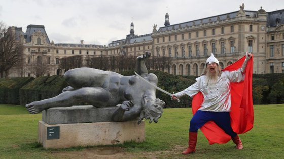 Из секретного рапорта агента Александра Шабурова из Парижа куратору Марии Кравцовой в Москве. Пару лет назад мы оказались на фестивале в пригороде Парижа по программе культурного обмена между Новосибирском и этим самым пригородом. Вместе с Таней Лазаревой из КВН, карикатуристом Елкиным, оперным театром и хором казаков. Для пущей экзотичности прикрепили нас к социальной столовой для малоимущих пенсионеров. Чиновники мэрии сказали: — А что, мы и сами тут питаемся! Я ответил: — Ну что ж, надо когда-то начинать к этому привыкать... В свободное время продолжали по инерции чего-то снимать: визуализировали сиюминутные пропагандистские мемы. Тогда, видимо, опять про «русскую угрозу» речь завели. Если кто не знает, придумали ее французы во времена Наполеона, когда растиражировали фальшивое «Завещание Петра Великого». Дескать, это Петр планировал завоевать Европу, поэтому Наполеон — не оккупант, а освободитель. Французы же и «русскую душу» распропагандировали. У нас был карнавальный костюм богатыря, который мы уже использовали для съемки в Коломне, и фотограф Женя Иванов, которого мы в него наряжали, — тогда у Жени сломался фотоаппарат, зато имелась рыжая бороденка. Проехали с ним через весь Париж, заставляли приставать к ряженым рекламным цыплятам и мигрантам. Больше всего на богатыря вешались тетеньки с пониженной социальной ответственностью возле «Мулен-Руж». И только у Триумфальной арки нас ждал афронт. Мы хотели снять богатыря с мечом на фоне знаменитого рельефа Рида, но полиция у подземного перехода сказала: — Сами проходите, а этого человека в маскарадном костюме мы туда не пропустим. Попытались их обойти — не получилось. Они говорят: — Еще одна такая попытка — и будете ночевать в полиции. Оказалось, что это главный их мемориал: возле арки горит вечный огонь, а президент Франции в дни праздников возлагает сюда венки. Но мы-то этого не знали! Приехав в Москву, я пытался подшутить над моим другом куратором Ерофеевым, завзятым франкофилом, который тогда еще к тому же был главным популяризатором Pussy Riot: — В Париже к их святыням тоже не всех пускают... Но он уподобление свободного европейского рая нашему тоталитарному аду не поддержал. {gallery#345}