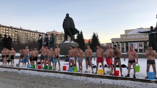 «Это не стыдно»: десятки крепких сибиряков в трусах облились водой перед памятником Ленину
