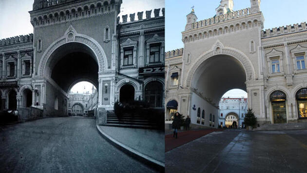 Сильно ли изменилась Москва за 20 лет? А какой она была 50, 70 лет назад? В нашей новой рубрике «Фотоархив» специальный корреспондент «Вечерки», фотограф Сергей Шахиджанян предлагает сравнить архивные и современные снимки столицы. Третьяковский проезд — небольшая улица, перпендикулярная Никольской, за многие годы практически не изменилась, но история ее появления весьма необычна. Мало кто знает, что Третьяковский проезд стал первой частной улицей, построенной в столице по инициативе домовладельцев. Проезд был построен в 1870-х годах. Братья Третьяковы, Павел и Сергей, решили снести часть построек на принадлежащей им территории и буквально «прорубили» еще один въезд на Никольскую улицу. При этом в Китайгородской стене рядом с Птичьей башней были прорублены Третьяковские ворота, стилизованные под русскую старину. Сейчас в Третьяковском проезде располагаются магазины, торгующие дорогой одеждой и автомобилями. В дореволюционное время было точно так же, но площади торговцы готовым платьем делили с известными в Москве нотариусами. Как утверждает исследователь Сергей Ходнев, идея создания проезда возникла совершенно случайно — когда Павел Третьяков попал в «глухую» пробку на Никольской: то ли из-за отвалившегося колеса кареты, то ли из-за столкновения телег улица «встала». Тогда-то ему и пришла в голову идея разгрузить улицу, создав съезд. Благотворители выкупили землю — и Никольская, что называется, поехала. А на территории проезда стали появляться магазины и конторы. Если посмотреть на старинную и современную фотографии, видно, что проезд не сильно изменился. Разве что теперь он стал пешеходным, как, впрочем, и Никольская улица.