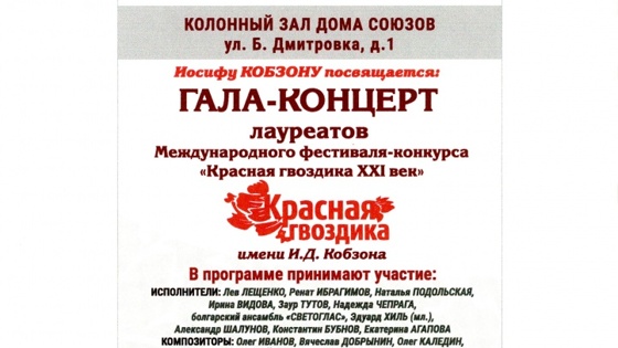 В 2014 году, благодаря поддержке Главы Государства, Президента РФ В. В. Путина (номер поручения ПР846 от 30.04.2016г.), был возрожден Международный фестиваль-конкурс национальной патриотической песни «Красная гвоздика». Президентом конкурса на протяжении последних лет был Народный артист СССР, Герой Труда РФ И. Д. Кобзон, и после его ухода было принято решение присвоить самому фестивалю имя И. Д. Кобзона. Конкурс в советское время, был главным конвейером производства произведений, символизирующих собой эпоху настоящих массовых песен, сникавших любовь советского и российского зрителя. 17 февраля 2019 года, в Колонном Зале Дома Союзов, в 18:00, пройдет уже третий, ежегодный, финальный гала-концерт победителей и лауреатов конкурса 2018 года - «Красная гвоздика XXI век - Иосифу Кобзону посвящается». В программе будут представлены композиторы: Юрий Антонов, Олег Иванов, Александр Морозов, Вячеслав Добрынин, Игорь Саруханов, Тихон Хренников мл., Раиса Саед-Шах, Александр Добронравов, Аркадий Хоралов, Александр Клевицкий. Исполнители: Лев Лещенко, Ринат Ибрагимов, Заур Тутов, Эдуард Хиль мл, ансамбль «Светоглас» (Болгария), Иорданка Христова, Марк Тишман, Зара, а также молодые композиторы и исполнители - победители и лауреаты региональных и зарубежных отборочных туров 2018 года.