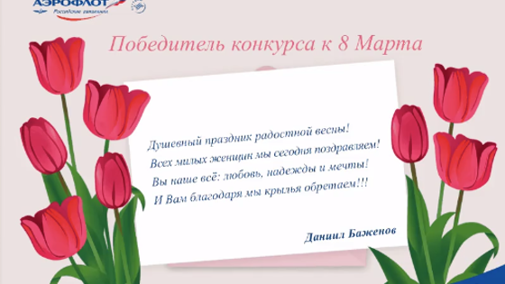 Авиакомпания «Аэрофлот» приготовила особое поздравление женщинам, которым выпало отметить праздник 8 Марта на борту самолетов авиаперевозчика, сообщает пресс-служба «Аэрофлота». В этот день пассажиркам по громкой связи посвящают стихи, отобранные по итогам конкурса, проведенного среди подписчиков страницы авиакомпании во ВКонтакте. «Преподносить 8 Марта подарок в виде стихов и цветов женщинам, которые путешествуют нашими рейсами — одна из добрых традиций "Аэрофлота"», — признался генеральный директор авиакомпании Виталий Савельев. «Присоединяюсь к своим коллегам и от имени всех мужчин авиакомпании поздравляю представительниц прекрасного пола с Международным женским днем. Желаю здоровья и любви, весеннего солнца и тепла, а также приятных путешествий с Аэрофлотом!», — подытожил он. Всего на конкурс было направлено более 900 стихотворений, присланных из разных городов России. Жюри из представителей «Аэрофлота» тайным голосованием отобрало троих финалистов. Во втором этапе конкурса вновь приняли участие подписчики аккаунта «Аэрофлота», но уже в роли критиков. По результатам, был назван победитель, набравший наибольшее число голосов. Им оказалось четверостишие, которое прислал Даниил Баженов. Победителю помимо признания его поэтического таланта будет вручен сертификат на два лица на перелет туда-обратно классом Эконом в любой город маршрутной сети «Аэрофлота».